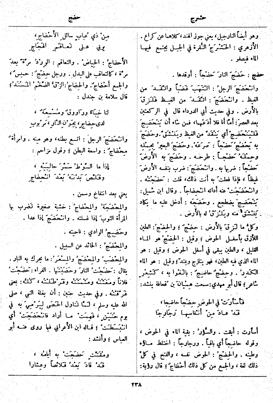 يَعْنِي بَعْدَ انْتِفَاخٍ وَسِمَنٍ. والمِحْضَجَةُ والمِحْضاجُ: خَشَبَةٌ صَغِيرَةٌ تَضرب بِهَا المرأَة الثوبَ إِذا غَسَلَتْهُ. وانْحَضَجَ إِذا عَدَا. وحَضِيجُ الْوَادِي: نَاحِيَتُهُ. والمِحْضَجُ: الْحَائِدُ عَنِ السَّبِيلِ. والمِحْضَبُ والمِحْضَجُ والمِسْعَرُ: مَا يُحَرَّكُ بِهِ النَّارُ. يُقَالُ: حَضَجْتُ النارَ وحَضَبْتُها. الْفَرَّاءُ: حَضَجْتُ فُلَانًا ومَغَثْتُه ومَثْمَثْتُه وقَرْطَلْتُه، كُلُّه: بِمَعْنَى غَرَّقْتُه. وَفِي حَدِيثِ حُنَيْنٍ: