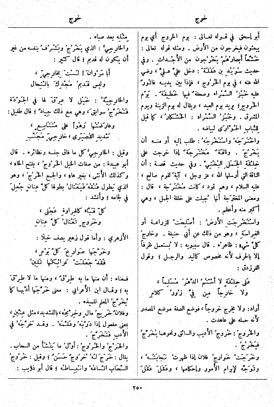 أَراد: وَلَا يَخْرُجُ خُرُوجًا، فَوَضَعَ الصِّفَةَ مَوْضِعَ الْمَصْدَرِ لأَنه حَمَلَهُ عَلَى عَاهَدْتُ. والخُروجُ: خُروجُ الأَديب وَالسَّائِقِ وَنَحْوِهِمَا يُخَرَّجُ فيَخْرُجُ. وخَرَجَتْ خَوارجُ فُلَانٍ إِذا ظهرتْ نَجابَتُهُ وتَوَجَّه لإِبرام الأُمورِ وإِحكامها، وعَقَلَ عَقْلَ مِثْلِه بَعْدَ صِبَاهُ. والخارِجِيُّ: الَّذِي يَخْرُجُ ويَشْرُفُ بِنَفْسِهِ مِنْ غَيْرِ أَن يَكُونَ لَهُ قَدِيمٌ؛ قَالَ كُثَيِّرٌ:
