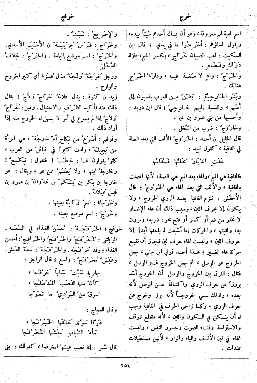 فَالْقَافِيَةُ هِيَ الْمِيمُ، وَالْهَاءُ بَعْدَ الْمِيمِ هِيَ الصِّلَةُ، لأَنها اتَّصَلَتْ بِالْقَافِيَّةِ، والأَلف الَّتِي بَعْدَ الْهَاءِ هِيَ الخُرُوجُ؛ قَالَ الأَخفَش: تَلْزَمُ الْقَافِيَةُ بَعْدَ الرَّوِيِّ الْخُرُوجَ، وَلَا يَكُونُ إِلا بِحَرْفِ اللِّينِ، وَسَبَبُ ذَلِكَ أَن هَاءَ الإِضمار لَا تَخْلُو مِنْ ضَمٍّ أَو كَسْرٍ أَو فَتْحٍ نَحْوَ: ضَرَبَهُ، وَمَرَرْتُ بِهِ، وَلَقِيتُهَا، وَالْحَرَكَاتُ إِذا أُشبعت لَمْ يَلْحَقْهَا أَبداً إِلا حُرُوفُ اللِّينِ، وَلَيْسَتِ الْهَاءُ حَرْفَ لِينٍ فَيَجُوزُ أَن تَتْبَعَ حَرَكَةَ هَاءِ الضَّمِيرِ؛ هَذَا أَحد قَوْلَيِ ابْنِ جِنِّي، جَعَلَ الْخُرُوجَ هُوَ الْوَصْلَ، ثُمَّ جَعَلَ الْخُرُوجَ غَيْرَ الْوَصْلِ، فَقَالَ: الْفَرْقُ بَيْنَ الْخُرُوجِ وَالْوَصْلِ أَن الْخُرُوجَ أَشد بُرُوزًا عَنْ حَرْفِ الرَّوِيِّ وَاكْتِنَافًا مِنَ الْوَصْلِ لأَنه بَعْدَهُ، وَلِذَلِكَ سُمِّيَ خُرُوجًا لأَنه بَرَزَ وَخَرَجَ عَنْ حَرْفِ الرَّوِيِّ، وَكُلَّمَا تَرَاخَى الْحَرْفُ فِي الْقَافِيَةِ وَجَبَ لَهُ أَن يَتَمَكَّنَ فِي السُّكُونِ وَاللِّينِ، لأَنه مَقْطَعٌ لِلْوَقْفِ وَالِاسْتِرَاحَةِ وَفَنَاءِ الصَّوْتِ وَحُسُورِ النَّفَسِ، وَلَيْسَتِ الْهَاءُ فِي لِينِ الأَلف وَالْيَاءِ وَالْوَاوِ، لأَنهن مُسْتَطِيلَاتٌ مُمْتَدَّاتٌ. والإِخْرِيجُ: نَبْتٌ. وخَرَاجِ: فَرَسُ جُرَيْبَةَ بْنِ الأَشْيَمِ الأَسدي. والخَرْجُ: اسْمُ مَوْضِعٍ بِالْيَمَامَةِ. والخَرْجُ: خِلافُ الدَّخْلِ. وَرَجُلٌ خُرَجَةٌ وُلَجَةٌ مِثَالُ هُمَزة أَي كَثِيرُ الْخُرُوجِ وَالْوُلُوجِ. زَيْدُ بْنُ كَثْوَةَ: يُقَالُ فلانٌ خَرَّاجٌ وَلّاجٌ؛ يُقَالُ ذَلِكَ عِنْدَ تأْكيد الظَّرْفِ وَالِاحْتِيَالِ. وَقِيلَ: خَرّاجٌ وَلّاجٌ إِذا لَمْ يُسْرِعْ فِي أَمر لَا يَسْهُلْ لَهُ الْخُرُوجُ مِنْهُ إِذا أَراد ذَلِكَ. وَقَوْلُهُمْ: أَسْرَعُ مِنْ نِكاحِ أُمِّ خارجَةَ، هِيَ امرأَة مِنْ بَجِيلَةَ، وَلَدَتْ كَثِيرًا فِي قبائلَ مِنَ الْعَرَبِ، كَانُوا يَقُولُونَ لَهَا: خِطْبٌ فَتَقُولُ: نِكْحٌ وخارجةُ ابْنُهَا، وَلَا يُعْلَمُ مِمَّنْ هُوَ؛ وَيُقَالُ: هُوَ خَارِجَةُ بْنُ بَكْرِ بْنِ يَشْكُرَ بْنِ عَدْوانَ بْنُ عَمْرِو بْنِ قَيْسِ عَيْلانَ. وخَرْجاءُ: اسمُ رَكِيَّة بِعَيْنِهَا. وخَرْجٌ: اسم موضع بعينه.