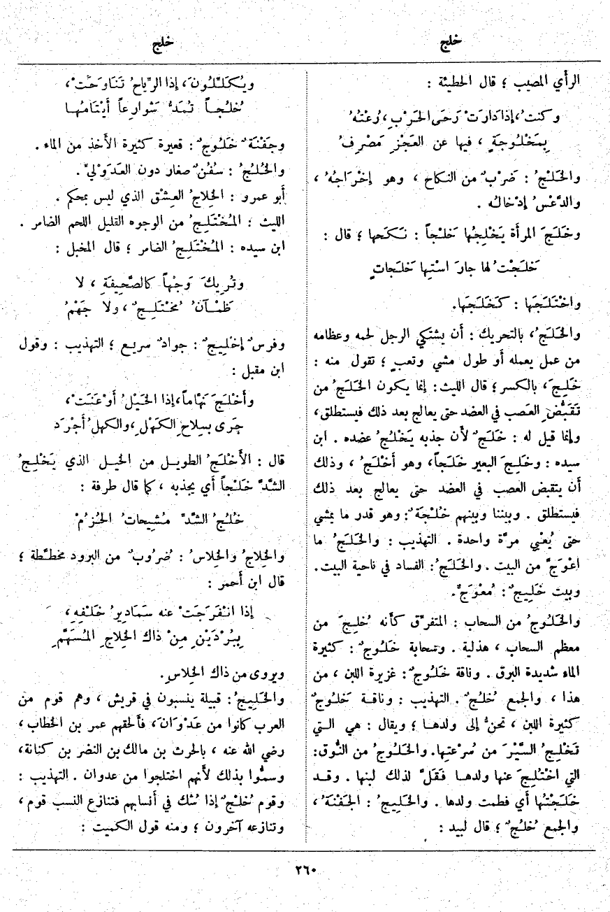 واخْتَلَجَها: كَخَلَجَها. والخَلَجُ، بِالتَّحْرِيكِ: أَن يَشْتَكِيَ الرَّجُلُ لَحْمَهُ وَعِظَامَهُ مِنْ عَمَلٍ يَعْمَلُهُ أَو طُولِ مَشْيٍ وتعبٍ؛ تَقُولُ مِنْهُ: خَلِجَ، بِالْكَسْرِ؛ قَالَ اللَّيْثُ: إِنما يَكُونُ الخَلَجُ مِنْ تَقَبُّضِ العَصب فِي الْعَضُدِ حَتَّى يُعَالَجَ بَعْدَ ذَلِكَ فَيُسْتَطْلَقُ، وإِنما قِيلَ لَهُ: خَلَجٌ لأَن جَذْبَهُ يَخْلُجُ عَضُدَهُ. ابْنُ سِيدَهْ: وخَلِجَ الْبَعِيرُ خَلَجاً، وَهُوَ أَخْلَجُ، وَذَلِكَ أَن يَتَقَبَّضَ الْعَصَبُ فِي الْعَضُدِ حَتَّى يُعَالَجَ بَعْدَ ذَلِكَ فَيُسْتَطْلَقُ. وَبَيْنَنَا وَبَيْنَهُمْ خُلْجَةٌ: وَهُوَ قَدْرُ مَا يَمْشِي حَتَّى يُعْيي مرَّة وَاحِدَةً. التَّهْذِيبُ: والخَلَجُ مَا اعْوَجَّ مِنَ الْبَيْتِ. والخَلَجُ: الْفَسَادُ فِي نَاحِيَةِ الْبَيْتِ. وَبَيْتٌ خَلِيجٌ: مُعْوَجٌّ. والخَلُوجُ مِنَ السَّحَابِ: المتفرِّق كأَنه خُلِجَ مِنْ مُعْظَمِ السَّحَابِ، هُذْلِيَّةٌ. وَسَحَابَةٌ خَلُوجٌ: كَثِيرَةُ الماءِ شَدِيدَةُ الْبَرْقِ. وَنَاقَةٌ خَلُوجٌ: غَزِيرَةُ اللَّبَنِ، مِنْ هَذَا، وَالْجَمْعُ خُلُجٌ. التهذيب: وناقة خَلُوجٌ كثير اللَّبَنِ، تحنُّ إِلى وَلَدِهَا؛ وَيُقَالُ: هِيَ الَّتِي تَخْلِجُ السَّيْرَ مِنْ سُرْعتِها. والخَلُوجُ مِنَ النُّوق: الَّتِي اخْتُلِجَ عَنْهَا وَلَدُهَا فَقَلَّ لِذَلِكَ لَبَنُهَا. وَقَدْ خَلَجْتُها أَي فَطَمْتُ وَلَدَهَا. والخَلِيجُ: الجَفْنَةُ، وَالْجَمْعُ خُلُجٌ؛ قَالَ لَبِيدٌ: