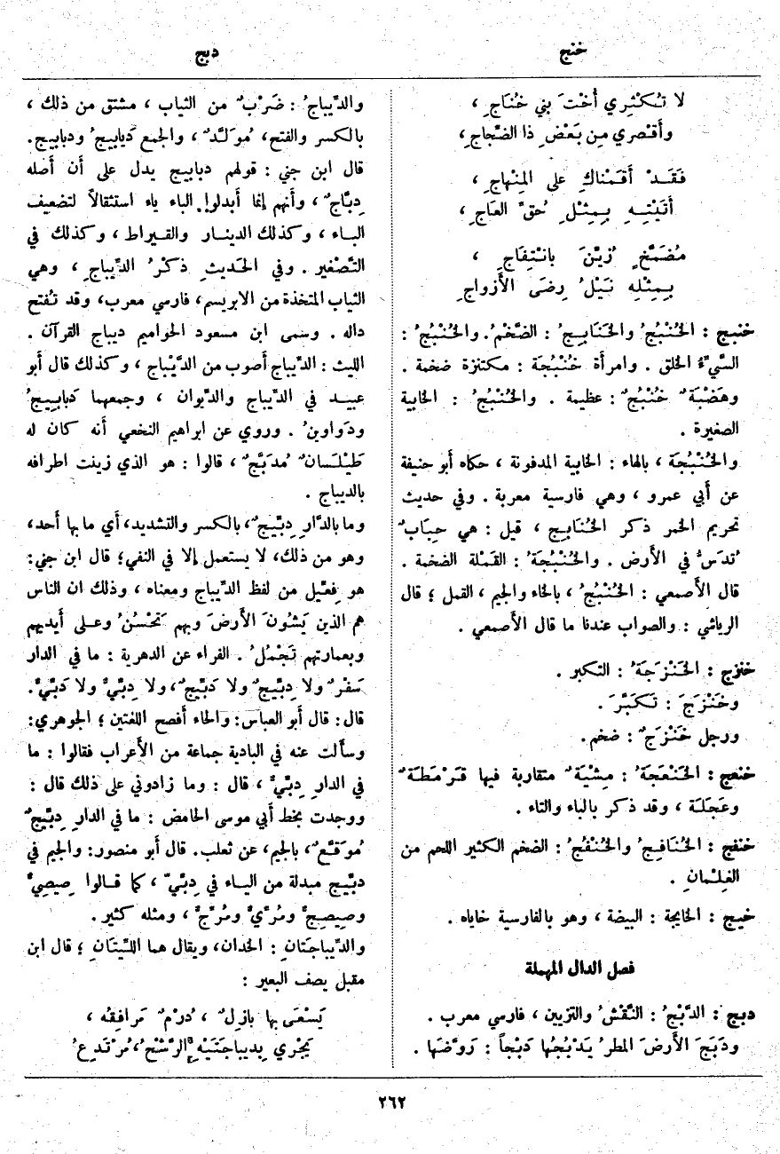 دبج: الدَّبْجُ: النَّقْشُ وَالتَّزْيِينُ، فَارِسِيٌّ مُعَرَّبٌ. ودَبَجَ الأَرضَ المطرُ يَدْبُجُها دَبْجاً: رَوَّضَها. والدِّيباحُ: ضَرْبٌ مِنَ الثِّيَابِ، مُشْتَقٌّ مِنْ ذَلِكَ، بِالْكَسْرِ وَالْفَتْحِ، مُوَلَّدٌ، وَالْجَمْعُ دَيابيجُ وَدَبَابِيجُ. قَالَ ابْنُ جِنِّيٍّ: قَوْلُهُمْ دَبَابِيجُ يَدُلُّ عَلَى أَن أَصله دِبَّاجٌ، وأَنهم إِنما أَبدلوا الْبَاءَ يَاءً اسْتِثْقَالًا لِتَضْعِيفِ الْبَاءِ، وَكَذَلِكَ الدِّينَارُ وَالْقِيرَاطُ، وَكَذَلِكَ فِي التَّصْغير. وَفِي الحَديثِ ذكْرُ الدِّيباجِ، وَهِيَ الثِّيَابُ الْمُتَّخَذَةُ مِنَ الْإِبْرِيسِمِ، فَارِسِيٌّ مُعَرَّبٌ، وَقَدْ تُفتح دَالُهُ. وَسَمَّى ابْنُ مَسْعُودٍ الْحَوَامِيمَ دِيبَاجَ الْقُرْآنِ. اللَّيْثُ: الدِّيباج أَصوب مِنَ الدَّيْباج، وَكَذَلِكَ قَالَ أَبو عُبَيْدٍ فِي الدِّيباج والدِّيوان، وَجَمْعُهُمَا دَبابِيجُ ودَواوينُ. وَرُوِيَ عَنْ إِبْرَاهِيمَ النَّخَعِيِّ أَنه كَانَ لَهُ طَيْلَسانٌ مُدَبَّجٌ، قَالُوا: هُوَ الَّذِي زُيِّنَتْ أَطْرَافُهُ بِالدِّيبَاجِ. وَمَا بالدَّارِ دِبِّيجٌ، بِالْكَسْرِ وَالتَّشْدِيدِ، أَي مَا بِهَا أَحد، وَهُوَ مِنْ ذَلِكَ، لَا يُسْتَعْمَلُ إِلا فِي النَّفْيِ؛ قَالَ ابْنُ جِنِّي: هُوَ فِعِّيل مِنْ لَفْظِ الدِّيباج وَمَعْنَاهُ، وَذَلِكَ أَن النَّاسَ هُمُ الذين يَشُونَ الأَرضَ وَبِهِمْ تَحْسُنُ وَعَلَى أَيديهم وَبِعِمَارَتِهِمْ تَجْمُلُ. الْفَرَّاءُ عَنِ الدَّهْرِيَّةِ: مَا فِي الدَّارِ سَفْرٌ وَلَا دِبِّيجٌ وَلَا دَبِّيجٌ، وَلَا دِبِّيٌّ وَلَا دَبِّيٌّ. قَالَ: قَالَ أَبو الْعَبَّاسِ: وَالْحَاءُ أَفصح اللُّغَتَيْنِ؛ الْجَوْهَرِيُّ: وسأَلت عَنْهُ فِي الْبَادِيَةِ جَمَاعَةً مِنَ الأَعراب فَقَالُوا: مَا فِي الدارِ دِبِّيٌّ، قَالَ: وَمَا زَادُونِي عَلَى ذَلِكَ قَالَ: وَوَجَدْتُ بِخَطِّ أَبي مُوسَى الْحَامِضِ: مَا فِي الدارِ دِبِّيجٌ مُوَقَّعٌ، بِالْجِيمِ، عَنْ ثَعْلَبٍ. قَالَ أَبو مَنْصُورٍ: وَالْجِيمُ فِي دبِّيج مُبْدَلَةٌ مِنَ الْيَاءِ فِي دِبِّيّ، كَمَا قَالُوا صِيصِيٌّ وصِيصِجٌّ ومُرِّيٌّ ومُرِّجٌّ، وَمِثْلُهُ كَثِيرٌ. والدِّيباجَتانِ: الْخَدَّانِ، وَيُقَالُ هُمَا اللِّيتَانِ؛ قَالَ ابْنُ مُقْبِلٍ يَصِفُ الْبَعِيرَ: