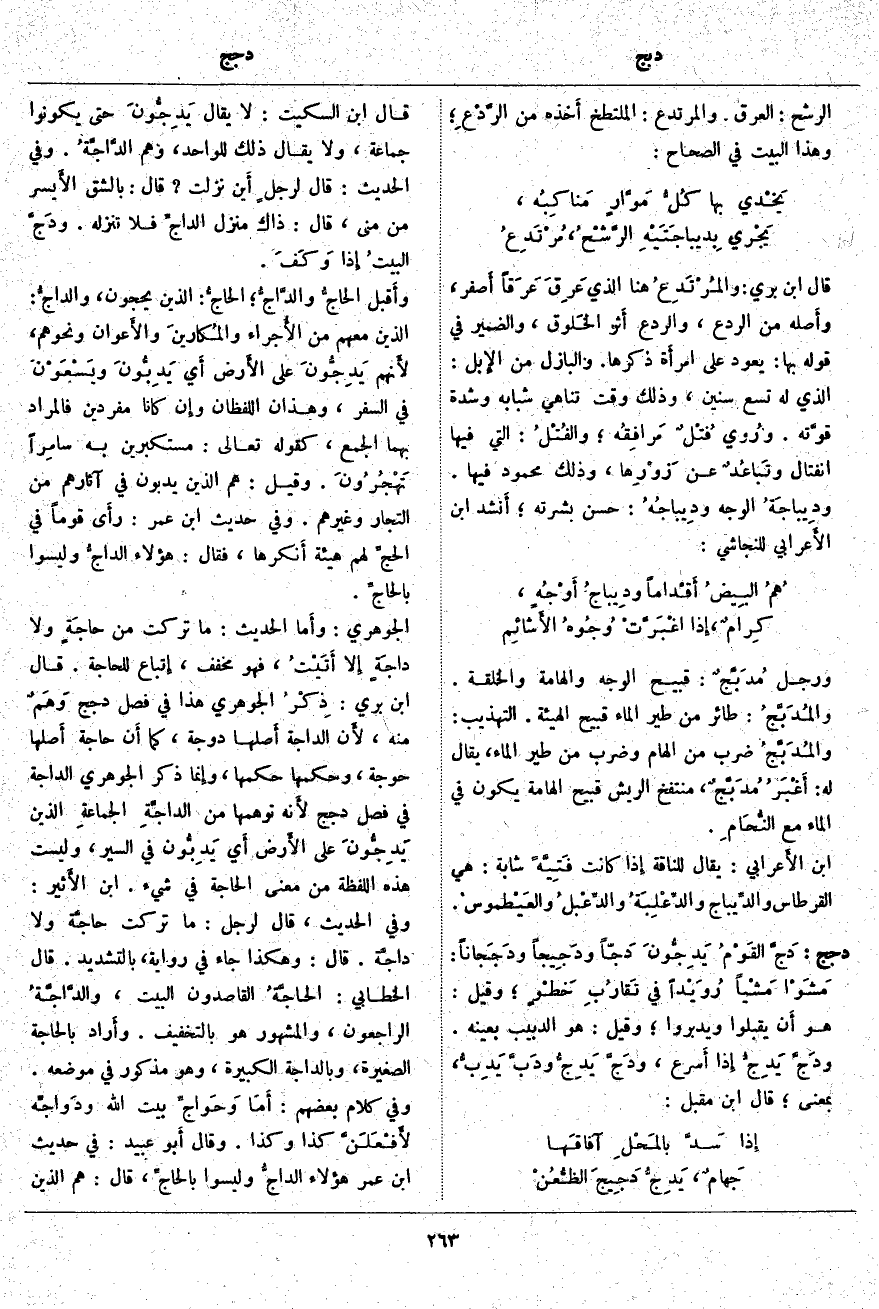 دجج: دَجَّ القَوْمُ يَدِجُّونَ دَجّاً ودَجِيجاً ودَجَجاناً: مَشَوْا مَشْياً رُوَيْداً فِي تَقارُبِ خَطْوٍ؛ وَقِيلَ: هُوَ أَن يُقْبِلُوا وَيُدْبِرُوا؛ وَقِيلَ: هُوَ الدَّبِيبُ بِعَيْنِهِ. ودَجَّ يَدِجُّ إِذا أَسرع، ودَجَّ يَدِجُّ ودَبَّ يَدِبُّ، بِمَعْنًى: قَالَ ابْنُ مُقْبِلٍ: