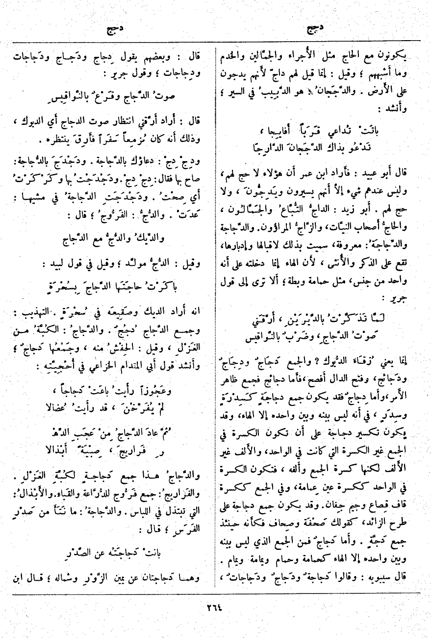 قَالَ أَبو عُبَيْدٍ: فأَراد ابْنُ عُمَرَ أَن هَؤُلَاءِ لَا حَجَّ لَهُمْ، وَلَيْسَ عِنْدَهُمْ شَيْءٌ إِلَّا أَنهم يَسِيرُونَ ويَدِجُّونَ، وَلَا حَجَّ لَهُمْ. أَبو زَيْدٍ: الداجُّ التُّبَّاعُ والجَمَّالُون، والحاجُّ أَصحاب النيَّات، والزَّاجُّ المراؤُون. والدَّجاجة والدِّجاجةُ: مَعْرُوفَةٌ، سُمِّيَتْ بِذَلِكَ لإِقبالها وإِدبارها، تَقَعُ عَلَى الذَّكَرِ والأُنثى، لأَن الْهَاءَ إِنما دَخَلَتْهُ عَلَى أَنه وَاحِدٌ مِنْ جِنْسٍ، مِثْلُ حَمَامَةٍ وَبَطَّةٍ؛ أَلا تَرَى إِلى قَوْلِ جَرِيرٍ:
