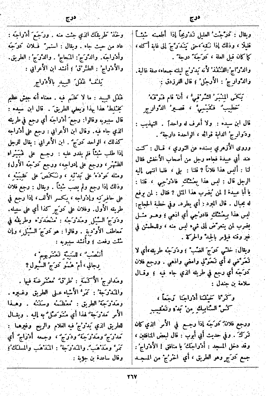 الأَدْراجُ: جَمْعُ دَرَجٍ وَهُوَ الطَّرِيقُ، أَي اخْرُجْ مِنَ الْمَسْجِدِ وخُذْ طريقَك الَّذِي جِئْتَ مِنْهُ. ورَجَعَ أَدْراجَه: عَادَ مِنْ حَيْثُ جَاءَ. وَيُقَالُ: استمرَّ فُلَانٌ دَرَجَه وأَدْراجَه. والدَّرَجُ: المَحاجُّ. والدَّرَجُ: الطَّرِيقُ. والأَدْراجُ: الطُّرُقُ: أَنشد ابْنُ الأَعرابي: