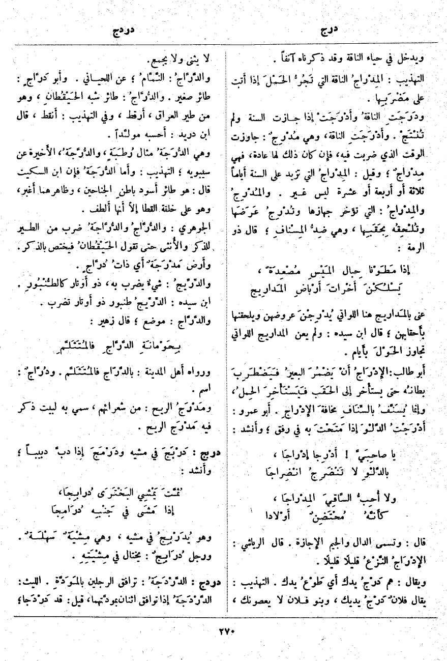 قَالَ: وَتُسَمَّى الدَّالُ وَالْجِيمُ الإِجازة. قَالَ الرِّيَاشِيُّ: الإِدْرَاجُ النَّزْعُ قَلِيلًا قَلِيلًا. وَيُقَالُ: هُمْ دَرْجُ يَدِكَ أَي طَوْعُ يَدِكَ. التَّهْذِيبُ: يُقَالُ فلانٌ دَرْجُ يَدَيْكَ، وَبَنُو فُلَانٍ لَا يَعْصُونَكَ، لَا يُثَنَّى وَلَا يُجْمَعُ. والدَّرَّاجُ: النَّمَّامُ؛ عَنِ اللِّحْيَانِيِّ. وأَبو دَرَّاجٍ: طَائِرٌ صَغِيرٌ. والدُّرَّاجُ: طَائِرٌ شِبْهُ الحَيْقُطانِ، وَهُوَ مِنْ طَيْرِ الْعِرَاقِ، أَرقط، وَفِي التَّهْذِيبِ: أَنقط، قَالَ ابْنُ دُرَيْدٍ: أَحسبه مولَّداً. وَهِيَ الدُّرَجَةُ مِثَالُ رُطَبَةٍ، والدُّرَّجَةُ، الأَخيرة عَنْ سِيبَوَيْهِ؛ التَّهْذِيبُ: وأَما الدُّرَجَةُ فإِن ابْنَ السِّكِّيتِ قَالَ: هُوَ طَائِرٌ أَسود باطنِ الْجَنَاحَيْنِ، وَظَاهِرُهُمَا أَغبر، وَهُوَ عَلَى خِلْقَةِ الْقَطَا إِلَّا أَنها أَلطف. الْجَوْهَرِيُّ: والدُّرَّاجُ والدُّرَّاجَةُ ضَرْبٌ مِنَ الطَّيْرِ لِلذَّكَرِ والأُنثى حَتَّى تَقُولَ الحَيْقُطانُ فَيَخْتَصُّ بِالذَّكَرِ. وأَرض مَدْرَجَةٌ أَي ذاتُ دُرَّاجٍ. والدِّرِّيجُ: شيءٌ يُضْرَبُ بِهِ، ذُو أَوتار كالطُّنْبُورِ. ابْنُ سِيدَهْ: الدِّرِّيجُ طُنْبُورٌ ذُو أَوتار تُضْرَبُ. والدَّرَّاج: مَوْضِعٌ؛ قَالَ زُهَيْرٍ: