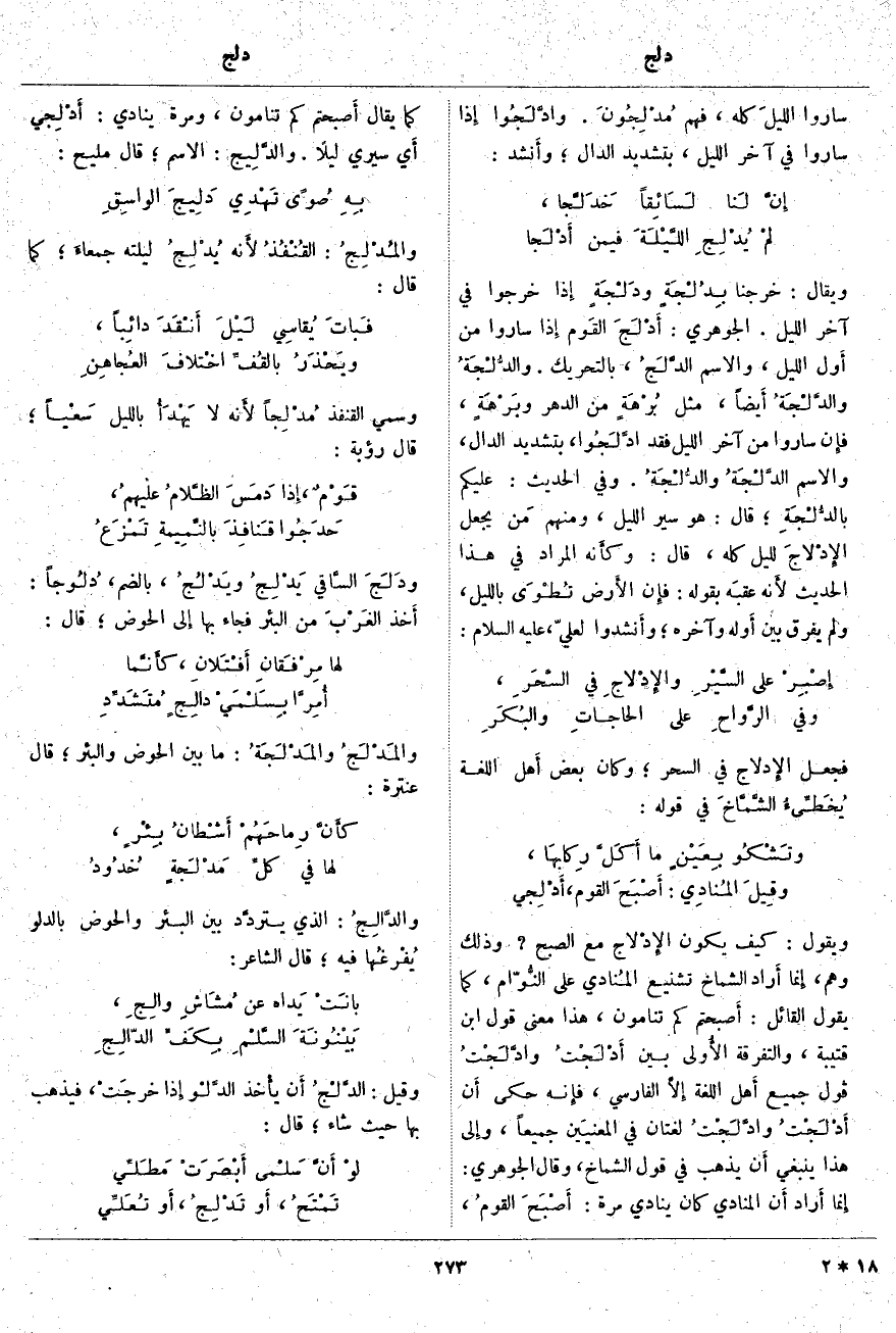 ؛ قَالَ: هُوَ سَيْرُ اللَّيْلِ، وَمِنْهُمْ مَن يَجْعَلُ الإِدْلاجَ لِلَّيْلِ كُلِّهِ، قَالَ: وكأَنه الْمُرَادُ فِي هَذَا الْحَدِيثِ لأَنه عقبَه بِقَوْلِهِ: فإِن الأَرض تُطْوَى بِاللَّيْلِ، وَلَمْ يُفَرِّقْ بَيْنَ أَوله وَآخِرِهِ؛ وأَنشدوا لِعَلِيٍّ، عَلَيْهِ السَّلَامُ: