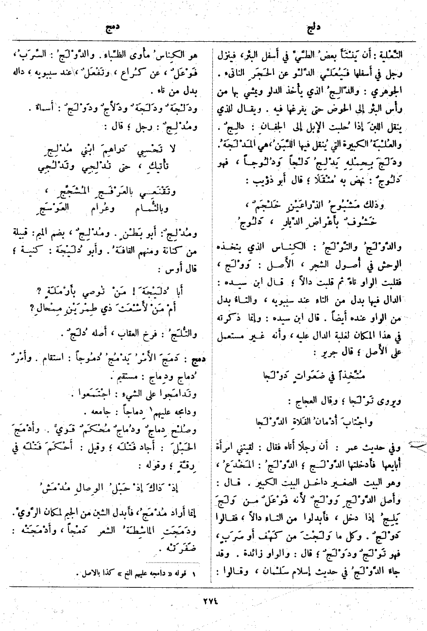 دمج: دَمَجَ الأَمْرُ يَدْمُجُ دُمُوجاً: اسْتَقَامَ. وأَمْرٌ دُماج ودِماج: مُسْتَقِيمٌ. وتَدامَجوا عَلَى الشيءِ: اجْتَمَعوا. وَدَامَجَهُ عَلَيْهِمْ «2» دِماجاً: جَامَعَهُ. وصُلْح دِماجٌ ودُماجٌ مُحْكَمٌ قَويٌّ. وأَدْمَجَ الحَبْلَ: أَجاد فَتْلَه؛ وَقِيلَ: أَحْكَمَ فَتْلَه فِي رِقَّةٍ؛ وَقَوْلُهُ: