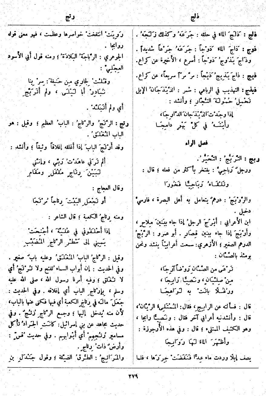 قَالَ: فسأَلته عَنِ الرابِجِ، فَقَالَ: المُمْتَلِئُ الرَّيَّانُ، قَالَ: وأَنشدنيه أَعرابي آخَرُ فَقَالَ: ونَصِيًّا رَابِجًا، وَهُوَ الْكَثِيفُ الْمُمْتَلِئُ، قَالَ: وَفِي هَذِهِ الأُرجوزة: