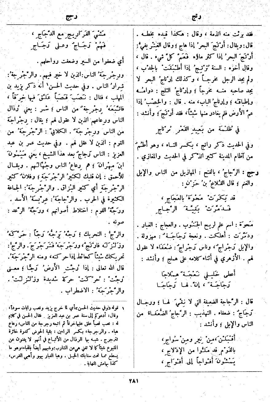 رجج: الرَّجاجُ، بِالْفَتْحِ: الْمَهَازِيلُ مِنَ النَّاسِ والإِبل وَالْغَنَمِ؛ قَالَ القُلاخُ بنُ حَزْنٍ: