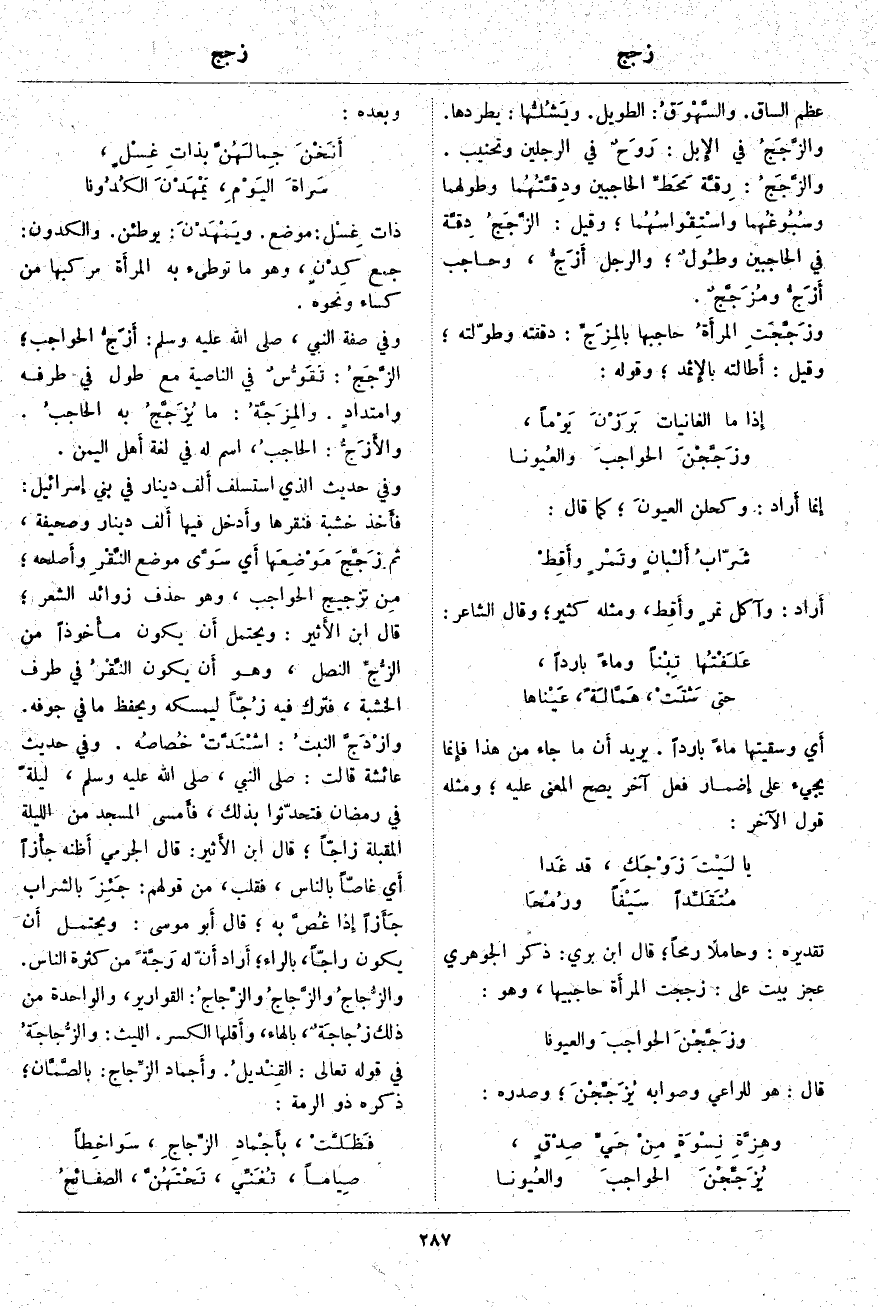 عَظْمُ السَّاقِ. والسَّهْوَقُ: الطَّوِيلُ. ويَشُلُّها: يَطْرُدُهَا. والزَّجَجُ فِي الإِبل: رَوَحٌ فِي الرَّجْلَيْنِ وَتَحْنِيبٌ. والزَّجَجُ: رِقَّة مَحَطِّ الْحَاجِبَيْنِ ودِقَّتُهُما وَطُولُهُمَا وسُبُوغُهما واسْتِقْواسُهُما؛ وَقِيلَ: الزَّجَجُ دِقَّة فِي الْحَاجِبَيْنِ وطُولٌ؛ وَالرَّجُلُ أَزَجُّ، وَحَاجِبٌ أَزَجُّ ومُزَجَّجٌ. وزَجَّجَتِ المرأَةُ حَاجِبَهَا بالمِزَجِّ: دَقَّقَتْهُ وَطَوَّلَتْهُ؛ وَقِيلَ: أَطالته بالإِثمد؛ وَقَوْلُهُ: