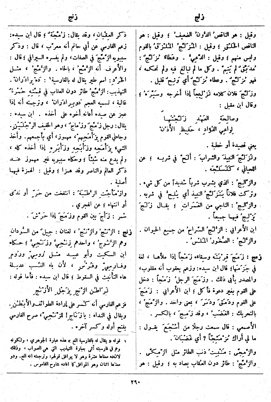 زنج: الزِّنْجُ والزَّنْجُ، لُغَتَانِ: جِيلٌ مِنَ السُّودانِ وَهُمُ الزُّنُوجُ، وَاحِدُهُمْ زِنْجِيٌّ وزَنْجِيٌّ؛ حكاه ابن السكيت وأَبو عُبَيْدٍ مِثْلُ رُومِيٍّ ورُومٍ وفارِسِيٍّ وفُرْسٍ، لأَن يَاءَ النَّسب عَدِيلَةُ هَاءِ التأْنيث فِي السُّقُوطِ؛ قَالَ ابْنُ سِيدَهْ: فأَما قَوْلُهُ: