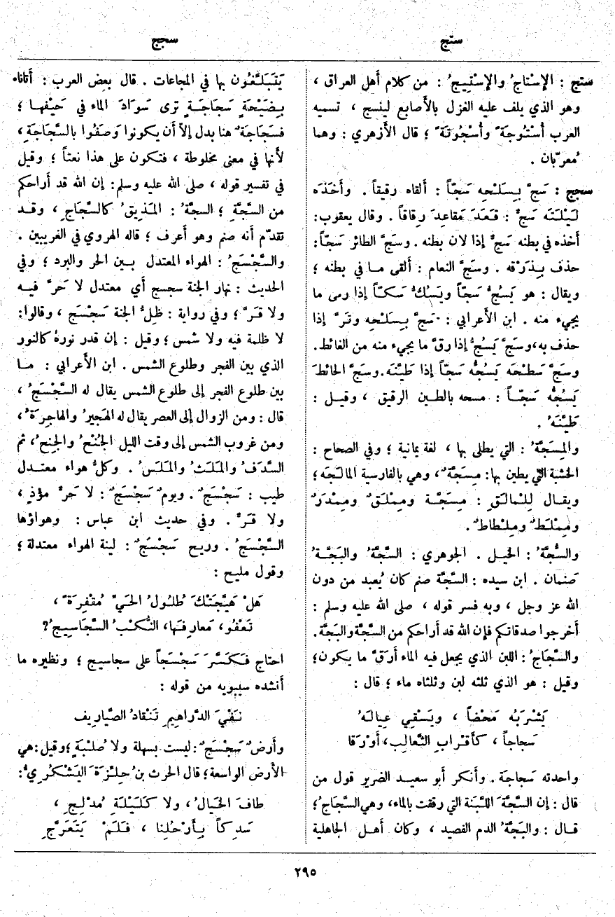 سجج: سَجَّ بِسَلْحِه سَجّاً: أَلقاه رَقِيقًا. وأَخَذَه لَيْلَتَه سَجٌّ: قَعَدَ مَقاعِدَ رِقاقاً. وَقَالَ يَعْقُوبُ: أَخذه فِي بَطْنِهِ سَجٌّ إِذا لَانَ بَطْنُهُ. وسَجَّ الطَّائِرُ سَجّاً: حَذَفَ بِذَرْقه. وسَجَّ النَّعَامُ: أَلقى مَا فِي بَطْنِهِ؛ وَيُقَالُ: هُوَ يَسُجُّ سَجّاً ويَسُكُّ سَكّاً إِذا رَمَى مَا يَجِيءُ مِنْهُ. ابْنُ الأَعرابي: سَجَّ بِسَلْحِه وتَرَّ إِذا حَذَفَ بِهِ، وسَجَّ يَسُجُّ إِذا رقَّ مَا يَجِيءُ مِنْهُ مِنَ الْغَائِطِ. وسَجَّ سَطْحَه يَسُجُّه سَجّاً إِذا طَيَّنَه. وسَجَّ الحائطَ يَسُجُّه سَجّاً: مَسَحَهُ بِالطِّينِ الرَّقِيقِ، وَقِيلَ: طَيَّنَهُ. والمِسَجَّةُ: الَّتِي يُطْلَى بِهَا، لُغَةٌ يمانيةٌ؛ وَفِي الصِّحَاحِ: الْخَشَبَةُ الَّتِي يُطَيَّنُ بِهَا: مِسَجَّةٌ، وَهِيَ بِالْفَارِسِيَّةِ المالَجَه؛ وَيُقَالُ لِلْمالَقِ: مِسَجَّة ومِمْلَقٌ ومِمْدَرٌ ومِمْلَطٌ ومِلْطاطٌ. والسُّجَّةُ: الْخَيْلُ. الْجَوْهَرِيُّ: السَّجَّةُ والبَجَّةُ صَنمان. ابْنُ سِيدَهْ: السَّجَّة صَنَمٌ كَانَ يُعبد مِنْ دُونِ اللَّهِ عَزَّ وَجَلَّ، وَبِهِ فُسِّرَ قَوْلُهُ، صَلَّى اللَّهُ عَلَيْهِ وَسَلَّمَ: