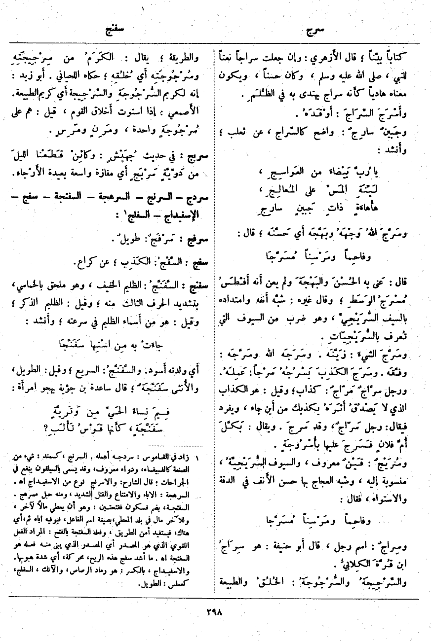 كِتَابًا بيِّناً؛ قَالَ الأَزهري: وإِن جَعَلْتَ سِرَاجًا نَعْتًا لِلنَّبِيِّ، صَلَّى اللَّهُ عَلَيْهِ وَسَلَّمَ، وَكَانَ حَسَنًا، وَيَكُونُ مَعْنَاهُ هَادِيًا كأَنه سِرَاجٌ يُهْتَدَى بِهِ فِي الظُّلَمِ. وأَسْرَجَ السِّرَاجَ: أَوْقَدَهُ. وجَبينٌ سارِجٌ: وَاضِحٌ كالسِّراج، عَنْ ثَعْلَبٍ؛ وأَنشد: