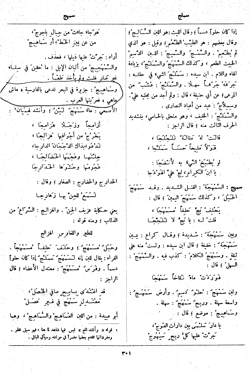أَراد: جَرَّتْ عَلَيْهَا ذَيْلَهَا، فَحَذَفَ. والسَّمْهَجِيجُ مِنْ أَلبان الإِبل: مَا حُقِنَ فِي سِقاء غَيْرِ ضَارٍ فَلَبِثَ وَلَمْ يأْخذ طَعْماً. وسَماهِيجُ: جَزِيرَةٌ فِي الْبَحْرِ تُدْعَى بِالْفَارِسِيَّةِ [ماش ماهي] فَعَرَّبَتْهَا الْعَرَبُ. الأَصمعي: ماءٌ سَمْهَجٌ لَيِّنٌ؛ وأَنشد لِهِمْيان «1»: