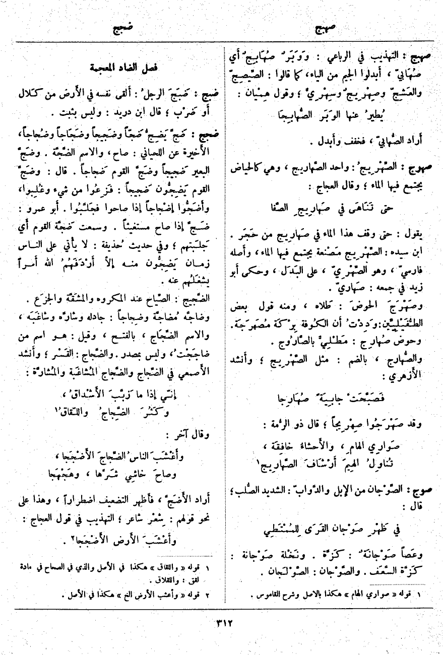 ضجج: ضَجَّ يَضِجُّ ضَجّاً وضَجيجاً وضَجَاجاً وضُجاجاً، الأَخيرة عَنِ اللِّحْيَانِيِّ: صَاحَ، وَالِاسْمُ الضَّجَّة. وضَجَّ الْبَعِيرُ ضَجيجاً وضَجَّ الْقَوْمُ ضَجاجاً. قَالَ: وضَجَّ الْقَوْمُ يَضِجُّون ضَجيجاً: فَزِعُوا مِنْ شَيْءٍ وغُلِبوا، وأَضَجُّوا إِضْجاجاً إِذا صَاحُوا فجَلَّبُوا. أَبو عَمْرٍو: ضَجَّ إِذا صَاحَ مُسْتَغِيثًا. وَسَمِعْتُ ضَجَّة الْقَوْمِ أَي جَلَبتهم؛ وَفِي حَدِيثِ