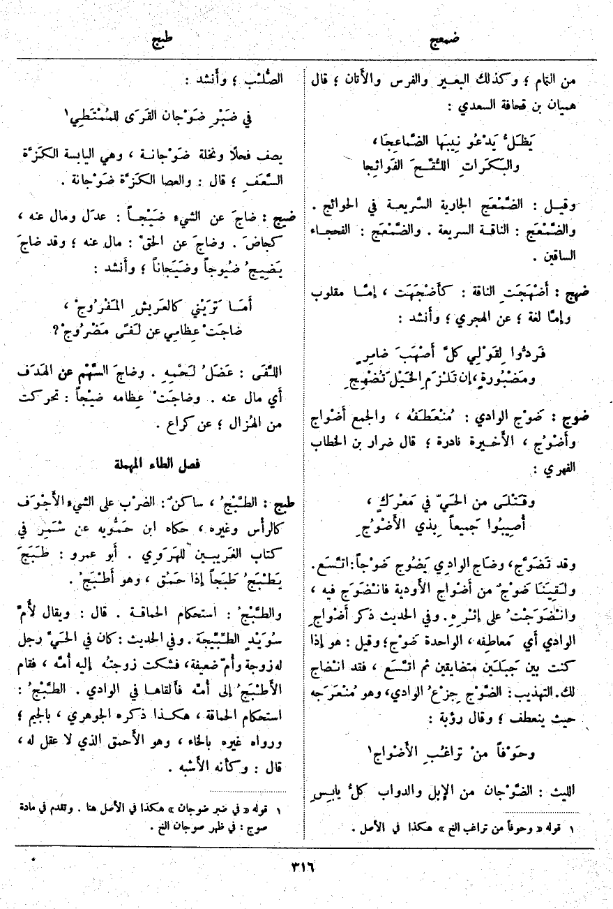 ضوج: ضَوْج الْوَادِي: مُنْعَطَفُه، وَالْجَمْعُ أَضْواج وأَضْوُج، الأَخيرة نَادِرَةٌ؛ قَالَ ضِرَارُ بْنُ الْخَطَّابِ الْفِهْرِيُّ: