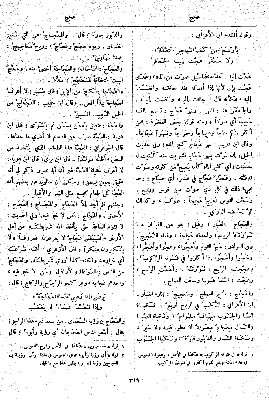 ؛ أَي كَثِيرُ الماءِ كأَنه يَعِجُّ مِنْ كَثْرَتِهِ وصَوْت تدفُّقه. وفَحْلٌ عَجَّاج فِي هَديره أَي صيَّاح؛ وَقَدْ يجيءُ ذَلِكَ فِي كُلِّ ذِي صوْت مِن قَوْسٍ وَرِيحٍ. وعَجَّت الْقَوْسُ تَعِجُّ عَجيجاً: صوَّتت، وَكَذَلِكَ الزَّنْدُ عِنْدَ الوَرْيِ. والعَجَاج: الغُبار، وَقِيلَ: هُوَ مِنَ الْغُبَارِ مَا ثَوَّرَتْه الرِّيحُ، وَاحِدَتُهُ عَجاجة، وَفِعْلُهُ التَّعْجيجُ. وَفِي النَّوَادِرِ: عَجَّ الْقَوْمُ وأَعَجُّوا، وهَجُّوا وأَهَجُّوا، وخَجُّوا وأَخَجُّوا إِذا أَكثروا فِي فُنُونه الرُّكوبَ «2». وعَجَّجَته الرِّيح: ثَوَّرتْهُ. وأَعَجَّتِ الرِّيح، وعَجَّت: اشتدَّ هُبوبها وَسَاقَتِ الْعَجَّاجَ. والعَجَّاج: مُثِير الْعَجَاجِ. والتعجيجُ: إِثارة الغُبار. ابْنُ الأَعرابي: النُّكْبُ فِي الرِّيَاحِ أَربعٌ: فنَكباءُ الصَّبا والجَنُوب مِهْيافٌ مِلْواحٌ، ونكباءُ الصَّبا والشَّمال مِعْجاجٌ مِصْرادٌ لَا مَطَرَ فِيهِ وَلَا خيرَ، ونَكْباءُ الشَّمال والدَّبُور قَرَّةٌ، ونَكْباءُ الجَنُوب والدَّبور حارَّة؛ قَالَ: والمِعْجاجُ هِيَ الَّتِي تُثِير الغُبار. وَيَوْمٌ مِعَجٌّ وعَجَّاجٌ، ورياحٌ مَعاجِيجُ: ضِدُّ مَهَاوين «3». والعَجَاجُ: الدُّخَان؛ والعَجَاجَة أَخصُّ مِنْهُ. وعَجَّجَ البيتَ دُخَاناً فَتَعَجَّجَ: مَلأَهُ. والعَجَاجة: الْكَثِيرُ مِنَ الإِبل؛ قَالَ شَمِر: لَا أَعرفُ العَجاجة بِهَذَا الْمَعْنَى. وَقَالَ ابْنُ حَبِيبٍ: العَجْعاجُ مِنَ الْخَيْلِ النَّجِيب المُسِنُّ. والعُجَّة: دَقِيقٌ يُعجَن بسَمْن ثُمَّ يُشْوَى؛ قَالَ ابْنُ دُرَيْدٍ: العُجَّة ضرْب مِنَ الطَّعَامِ لَا أَدري مَا حدُّها. قَالَ الْجَوْهَرِيُّ: العُجَّة هَذَا الطَّعَامُ الَّذِي يُتخذ مِنَ الْبَيْضِ، أَظنُّه مولَّداً. قَالَ ابْنُ دُرَيْدٍ: لَا أَعرف حَقِيقَةَ العُجَّة غَيْرَ أَن أَبا عَمْرٍو ذَكَرَ لِي أَنه دَقِيقٌ يُعْجَنُ بِسَمْنٍ؛ وَحَكَى ابْنُ خَالَوَيْهِ عَنِ بَعْضِهِمْ أَن العُجَّة كلُّ طَعَامٍ يُجمع مِثْلَ التَّمْرِ والأَقِطِ. وَجِئْتُهُمْ فَلَمْ أَجد إِلَّا العَجَاج والهَجَاج؛ العَجَاج: الأَحمق. والهَجَاج: مَن لَا خَيْرَ فِيهِ. وَفِي الْحَدِيثِ: