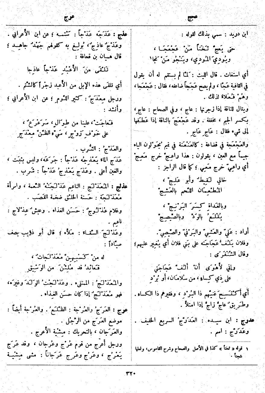 عذلج: المُعَذْلَج: الناعِم عَذْلَجَتْهُ النِّعمة، وامرأَة مُعَذْلَجَة: حَسنة الخلْق ضَخْمَةُ القَصَب. وَغُلَامٌ عُذْلُوجٌ: حَسَن الْغِذَاءِ. وعيشٌ عِذْلاج: ناعِم. وعَذْلَجَ السِّقاءَ: مَلأَه؛ قَالَ أَبو ذؤَيب يَصِفُ صيَّاداً: