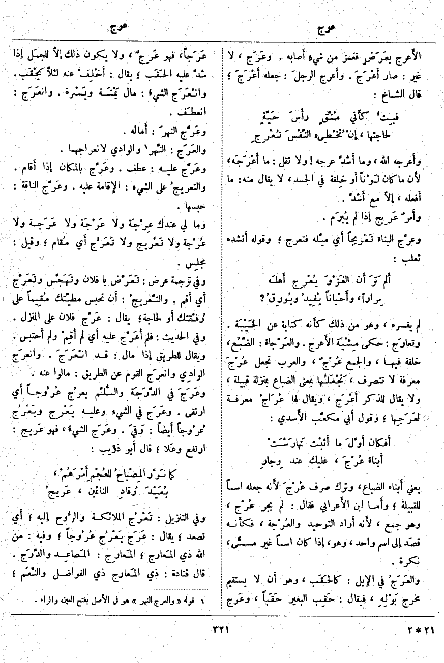 أَي لَمْ أُقِمْ وَلِمَ أَحتبس. وَيُقَالُ لِلطَّرِيقِ إِذا مَالَ: قَدِ انْعَرَجَ. وانعرَج الوادِي وانعرَج الْقَوْمُ عن الطَّرِيقِ: مَالُوا عَنْهُ. وَعَرَجَ فِي الدَّرَجَة والسُّلَّم يعرُج عُرُوجاً أَي ارْتَقَى. وعَرَج فِي الشيءِ وَعَلَيْهِ يَعْرِج ويَعْرُج عُرُوجاً أَيضاً: رَقيَ. وعَرَج الشيءُ، فَهُوَ عَريج: ارْتَفَعَ وعَلا؛ قَالَ أَبو ذؤَيب: