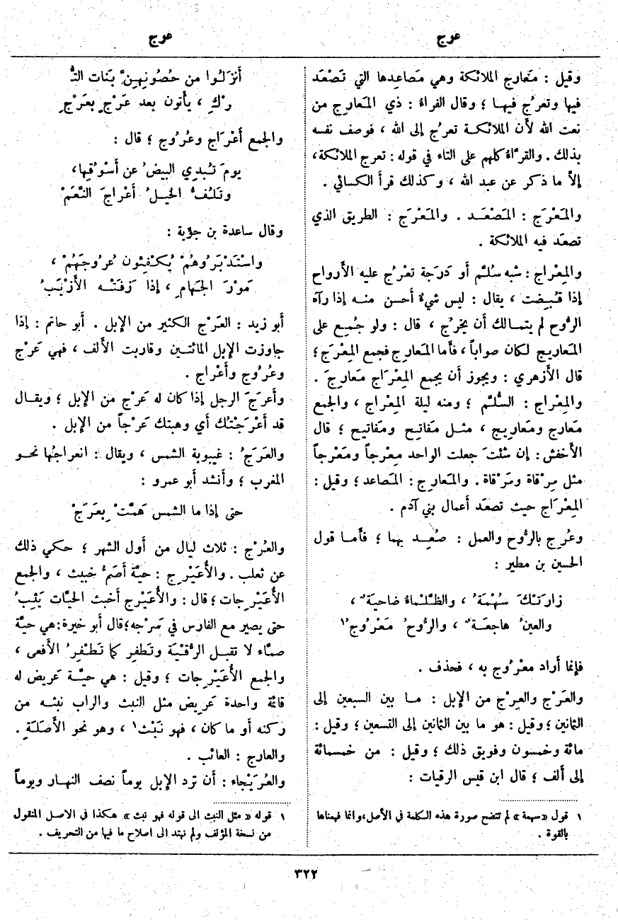 فإِنما أَراد معْرُوج بِهِ، فَحَذَفَ. والعَرْج والعِرْج مِنَ الإِبل: مَا بَيْنَ الْسَبْعِينَ إِلى الْثَمَانِينَ؛ وَقِيلَ: هُوَ مَا بَيْنَ الْثَمَانِينَ إِلى الْتِسْعِينَ؛ وَقِيلَ: مِائَةٌ وَخَمْسُونَ وَفُوَيْقَ ذَلِكَ؛ وَقِيلَ: مِنْ خَمْسِمِائَةٍ إِلى أَلف؛ قَالَ ابْنُ قَيْسِ الرُّقَيَّاتِ: