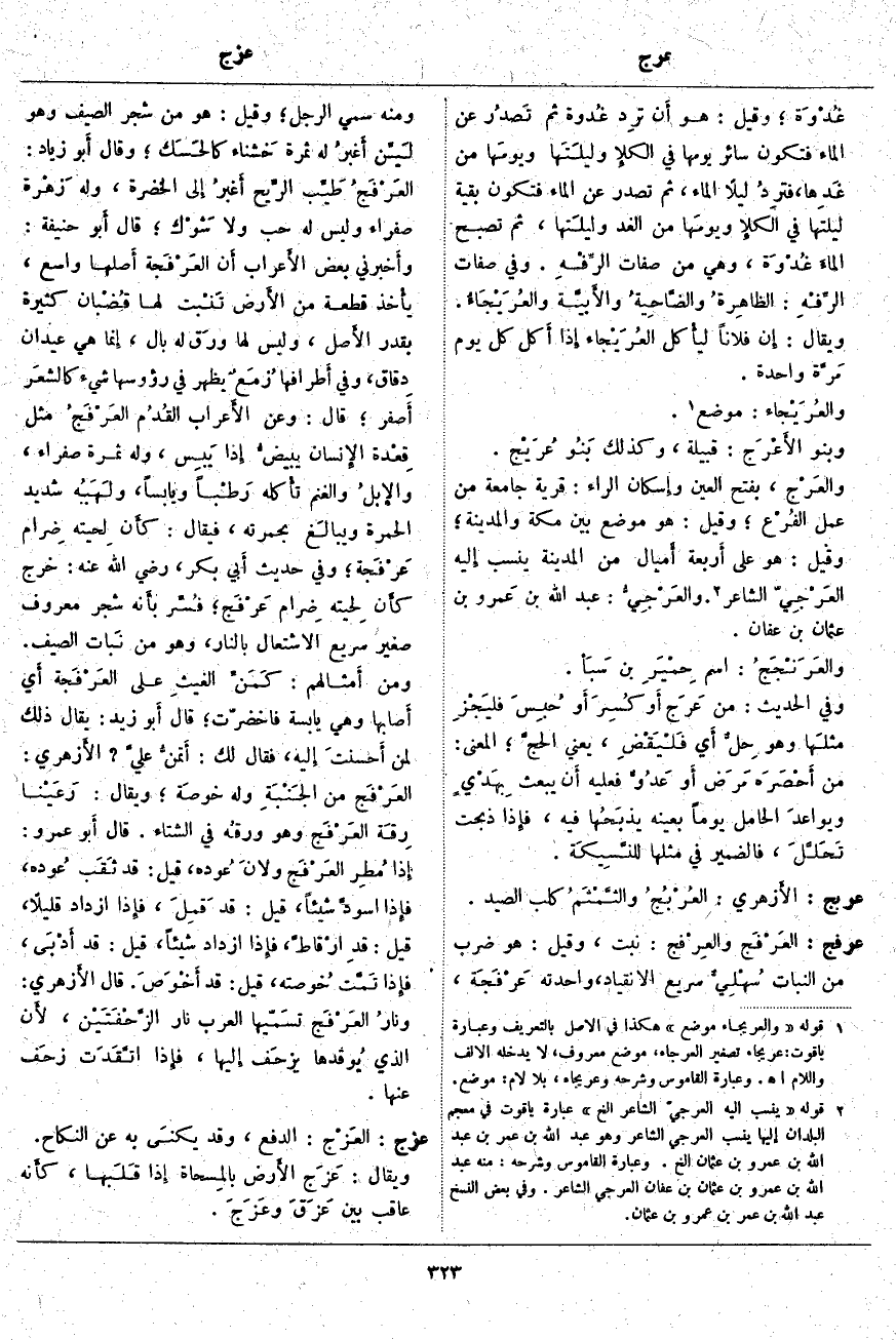 غُدْوَة؛ وَقِيلَ: هُوَ أَن ترِد غُدوة ثُمَّ تَصدُر عَنِ الْمَاءِ فَتَكُونُ سَائِرَ يَوْمِهَا فِي الكلإِ وليلَتَها ويومَها مِنْ غَدِها، فترِدُ لَيْلًا الْمَاءَ، ثُمَّ تَصْدُرُ عَنِ الْمَاءِ فَتَكُونُ بَقِيَّةَ لَيْلَتِهَا فِي الكلإِ ويومَها مِنَ الْغَدِ وليلَتها، ثُمَّ تُصْبِحُ الماءَ غُدْوَة، وَهِيَ مِنْ صِفَاتِ الرِّفْهِ. وَفِي صِفَاتِ الرِّفْهِ: الظاهِرةُ والضَّاحِيةُ والأَبيَّة والعُرَيْجَاءُ. وَيُقَالُ: إِن فُلَانًا ليأْكل العُرَيْجاء إِذا أَكل كُلَّ يَوْمٍ مَرَّة وَاحِدَةً. والعُرَيْجاء: مَوْضِعٌ «1». وَبَنُو الأَعْرَج: قَبِيلَةٌ، وَكَذَلِكَ بَنُو عُرَيْج. والعَرْج، بِفَتْحِ الْعَيْنِ وإِسكان الرَّاءِ: قَرْيَةٌ جَامِعَةٌ مِنْ عَمَلِ الفُرْع؛ وَقِيلَ: هُوَ مَوْضِعٌ بَيْنَ مَكَّةَ وَالْمَدِينَةِ؛ وَقِيلَ: هُوَ عَلَى أَربعة أَميال مِنْ الْمَدِينَةِ يُنْسَبُ إِليه العَرْجِيّ الشَّاعِرُ «2». والعَرْجِيُّ: عَبْدِ اللَّهِ بْنِ عَمرو بْنِ عُثْمَانَ بْنِ عَفَّانَ. والعَرَنْجَجُ: اسْمُ؛ حِمْيَرِ بْنِ سَبَأ. وَفِي الْحَدِيثِ: