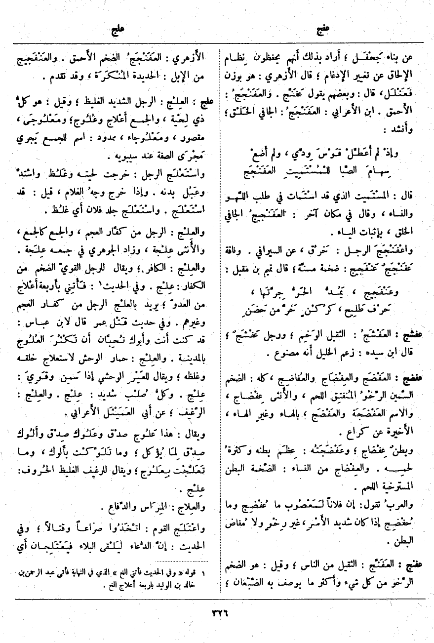 عفشج: العَفْشَجُ: الثَّقِيلُ الوَخِم؛ وَرَجُلٌ عَفْشَجٌ؛ قَالَ ابْنُ سِيدَهْ: زَعَمَ الْخَلِيلُ أَنه مصنوع.