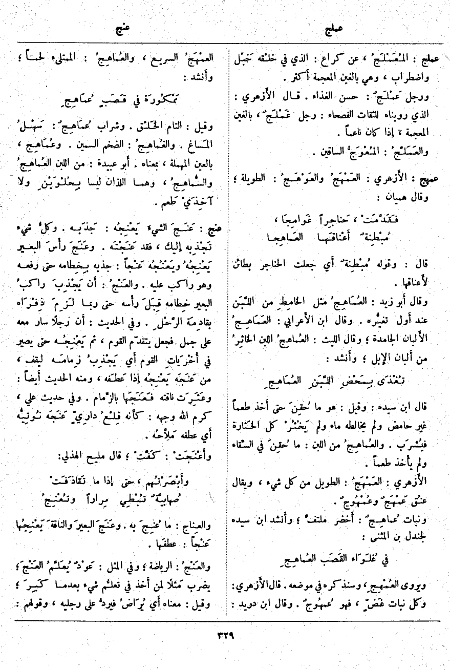 وَيُرْوَى العُمْهِجِ، وَسَنَذْكُرُهُ فِي مَوْضِعِهِ. قَالَ الأَزهري: وَكُلُّ نَبَاتٍ غَضٍّ، فَهُوَ عُمهُوجٌ. وَقَالَ ابْنُ دُرَيْدٍ: العمْهَجُ السَّرِيعُ، والعُماهِجُ: الْمُمْتَلِئُ لَحْمًا؛ وأَنشد: