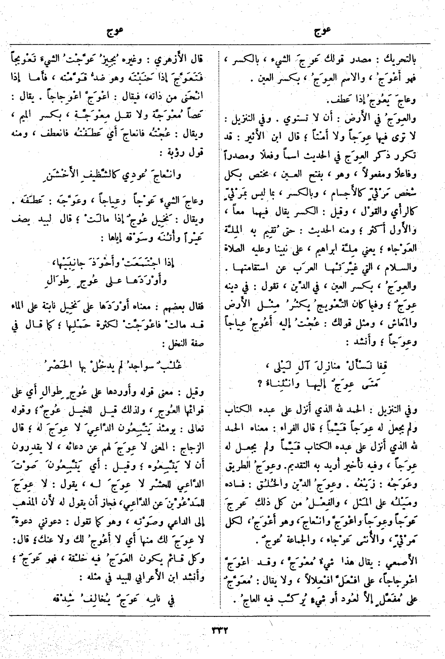 ؛ قَالَ الْفَرَّاءُ: مَعْنَاهُ الْحَمْدُ لِلَّهِ الَّذِي أَنزل عَلَى عَبْدِهِ الْكِتَابَ قَيِّماً وَلَمْ يَجْعَلْ لَهُ عِوَجاً، وَفِيهِ تأْخير أُريد بِهِ التَّقْدِيمُ. وعِوَجُ الطَّرِيقِ وعَوَجُه: زَيْغُه. وعِوَجُ الدِّين والخُلُق: فَسَادُهُ ومَيْلُه عَلَى المَثل، والفِعْلُ مِنْ كُلِّ ذَلِكَ عَوِجَ عَوَجاً وعِوَجاً واعْوَجَّ وانْعاجَ، وَهُوَ أَعْوَجُ، لِكُلِّ مَرْئيٍّ، والأُنثى عَوْجاء، وَالْجَمَاعَةُ عُوجٌ. الأَصمعي: يُقَالُ هَذَا شيءٌ مُعْوَجٌّ، وَقَدِ اعْوَجَّ اعْوِجاجاً، عَلَى افْعَلَّ افْعِلالًا، وَلَا يُقَالُ: مُعَوَّجٌ عَلَى مُفَعَّلٍ إِلَّا لعُود أَو شيءٍ يُركَّب فِيهِ العاجُ. قَالَ الأَزهري: وَغَيْرُهُ يُجِيزُ عَوَّجْتُ الشيءَ تَعْويجاً فَتَعَوَّجَ إِذا حَنَيْتَه وَهُوَ ضدُّ قَوَّمْته، فأَما إِذا انْحَنى مِنْ ذَاتِهِ، فَيُقَالُ: اعْوَجَّ اعْوِجاجاً. يُقَالُ: عَصاً مُعْوَجَّة وَلَا تَقُلْ مِعْوَجَّة، بِكَسْرِ الْمِيمِ، وَيُقَالُ: عُجْتُه فانعاجَ أَي عَطَفْتُه فَانْعَطَفَ، وَمِنْهُ قَوْلُ رُؤْبَةُ: