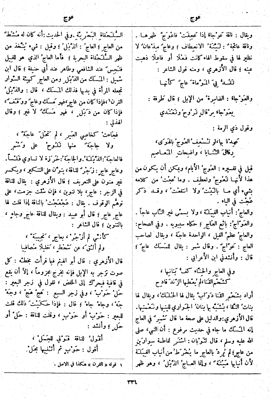 قِيلَ فِي تَفْسِيرِهِ: العُوجُ الأَيام، وَيُمْكِنُ أَن يَكُونَ مِنْ هَذَا لأَنها تَعُوجُ وتعطِف. وَمَا عُجْتُ مِنْ كَلَامِهِ بِشَيْءٍ أَي مَا بالَيْتُ وَلَا انتفعْتُ، وَقَدْ ذُكِرَ عُجْت فِي الْيَاءِ. والعاجُ: أَنياب الفِيَلَة، وَلَا يسمَّى غَيْرُ النَّاب عَاجًا. والعَوّاجُ: بَائِعُ العَاجِ؛ حَكَاهُ سِيبَوَيْهِ. وَفِي الصِّحَاحِ: والعاجُ عظمُ الْفِيلِ، الْوَاحِدَةُ عاجَة،. وَيُقَالُ لِصَاحِبِ الْعَاجِ: عَوَّاجٌ. وَقَالَ شِمْرٌ: يُقَالُ للمَسَك عاجٌ؛ قَالَ: وأَنشدني ابْنُ الأَعرابي: