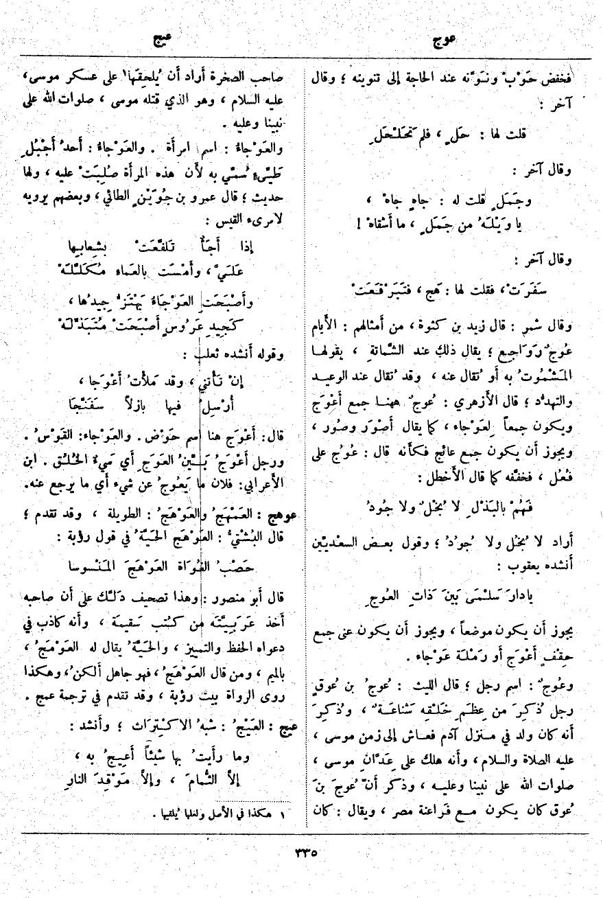 يَجُوزُ أَن يَكُونَ مَوْضِعًا، وَيَجُوزُ أَن يَكُونَ عَنَى جَمْعَ حِقْفٍ أَعْوَج أَو رَمْلَة عَوْجاء. وعُوجٌ: اسْمُ رَجُلٍ؛ قَالَ اللَّيْثُ: عُوجُ بْنُ عُوقٍ رَجُلٌ ذُكِرَ مِنْ عِظَمِ خَلْقِه شَناعَةٌ، وذُكِرَ أَنه كَانَ وُلِدَ فِي مَنْزِلِ آدَمَ فَعَاشَ إِلى زَمَنِ مُوسَى، عَلَيْهِ الصَّلَاةُ وَالسَّلَامُ، وأَنه هَلَكَ عَلَى عَدَّانِ [عِدَّانِ] مُوسَى، صَلَوَاتُ اللَّهُ عَلَى نَبِيِّنَا وَعَلَيْهِ، وَذَكَرَ أَنَّ عُوجَ بنَ عُوق كَانَ يَكُونُ مَعَ فَراعنة مِصْرَ، وَيُقَالُ: كَانَ صَاحِبَ الصَّخْرَةِ أَراد أَن يُلحِقَها «1» عَلَى عَسْكَرِ مُوسَى، عَلَيْهِ السَّلَامُ، وَهُوَ الَّذِي قَتَلَهُ مُوسَى، صَلَوَاتُ اللَّهُ عَلَى نَبِيِّنَا وَعَلَيْهِ. والعَوْجاءُ: اسْمُ امرأَة. والعَوْجاءُ: أَحدُ أَجْبُلِ طَيِّئٍ سُمِّي بِهِ لأَن هَذِهِ المرأَة صُلِبَتْ عَلَيْهِ، وَلَهَا حَدِيثٌ؛ قَالَ عَمْرِو بْنِ جُوَيْنٍ الطَّائِيِّ، وَبَعْضُهُمْ يَرْوِيهِ لِامْرِئِ الْقَيْسِ: