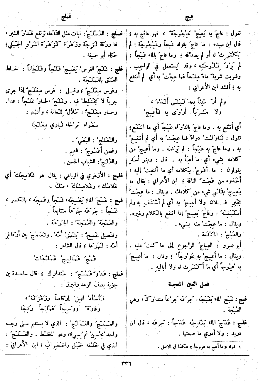 غلج: غَلَجَ الفرسُ يَغْلِجُ غَلْجاً وغَلَجاناً: خَلَطَ العَنَق بالهَمْلَجَة. وَفَرَسٌ مِغْلَجٌ: وَقِيلَ: فَرَسٌ مِغْلَجٌ إِذا جَرَى جَرْيًا لَا يَخْتَلِطُ فِيهِ. وغَلَجَ الحمارُ غَلْجاً: عَدَا. وَحِمَارٌ مِغْلَجٌ: شَلَّالٌ لِلْعانة؛ وأَنشد: