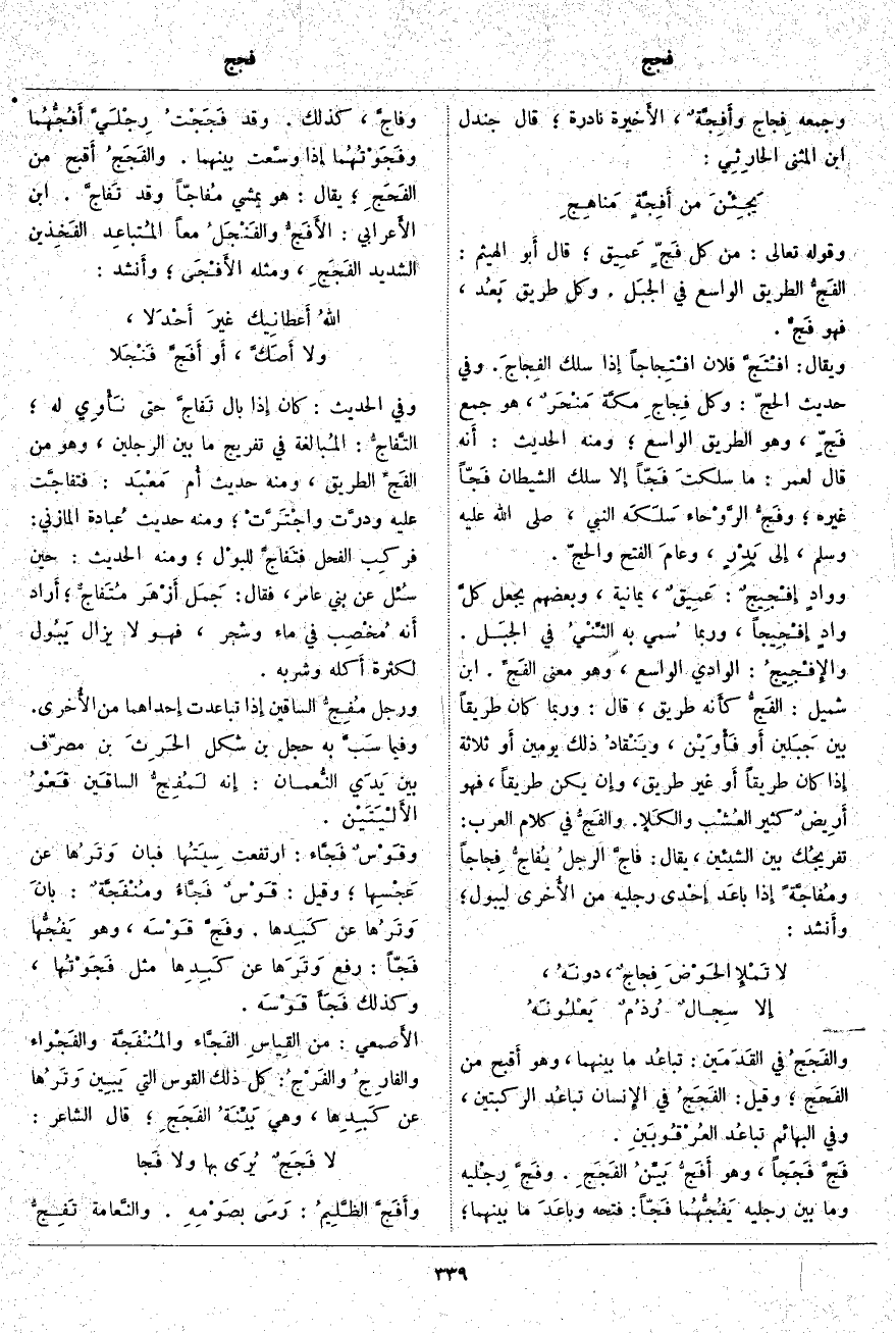 ؛ وفَجُّ الرَّوْحاء سَلَكَه النَّبِيُّ، صَلَّى اللَّهُ عَلَيْهِ وَسَلَّمَ، إِلى بَدْرٍ، وعامَ الْفَتْحِ وَالْحَجِّ. ووادٍ إِفْجِيجٌ: عَمِيقٌ، يَمَانِيَّةٌ، وَبَعْضُهُمْ يَجْعَلُ كلَّ وادٍ إِفْجِيجاً، وَرُبَّمَا سُمي بِهِ الثِّنْيُ فِي الجبَل. والإِفْجِيجُ: الْوَادِي الْوَاسِعُ، وَهُوَ مَعْنَى الفَجِّ. ابْنُ شُمَيْلٍ، الفَجُّ كأَنه طَرِيقٌ، قَالَ: وَرُبَّمَا كَانَ طَرِيقًا بَيْنَ جَبَلين أَو فَأْوَيْن، ويَنْقادُ ذَلِكَ يَوْمَيْنِ أَو ثَلَاثَةً إِذا كَانَ طَرِيقًا أَو غَيْرَ طَرِيقٍ، وإِن يَكُنْ طَرِيقًا، فَهُوَ أَرِيضٌ كَثِيرُ العُشْب والكَلإِ. والفَجُّ فِي كَلَامِ الْعَرَبِ: تفريجُك بَيْنَ الشَّيْئَيْنِ، يُقَالُ: فاجَّ الرجلُ يُفاجُّ فِجاجاً ومُفاجَّةً إِذا باعَد إِحْدى رِجْلَيْهِ مِنَ الأُخرى لِيَبُولَ؛ وأَنشد: