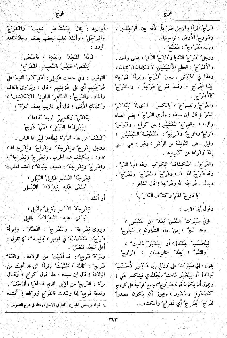 يَقُولُ: إِني صَبَرْتُ عَلَى رُزْئي بِابْنِ عَنْبَسٍ لأُحْسَبَ جَلْداً أَو لِيُخْبَر شامتٌ بتَجَلُّدي فَيَنْكَسِرَ عَني؛ وَيَجُوزُ أَن يَكُونَ قَوْلُهُ فُرُوجٌ، جَمْعُ فَرْجة عَلَى فُروج كَصَخْرةٍ وصُخُور، وَيَجُوزُ أَن يَكُونَ مَصْدَرًا لفَرَجَ يَفْرِجُ أَي تَفَرُّجٌ وَانْكِشَافٌ. أَبو زَيْدٍ: يُقَالُ لِلْمُشْطِ النحِيتُ والمُفَرَّجُ والمِرْجَلُ؛ وأَنشد ثَعْلَبٌ لِبَعْضِهِمْ يَصِفُ رَجُلًا شَاهَدَ الزُّورَ: