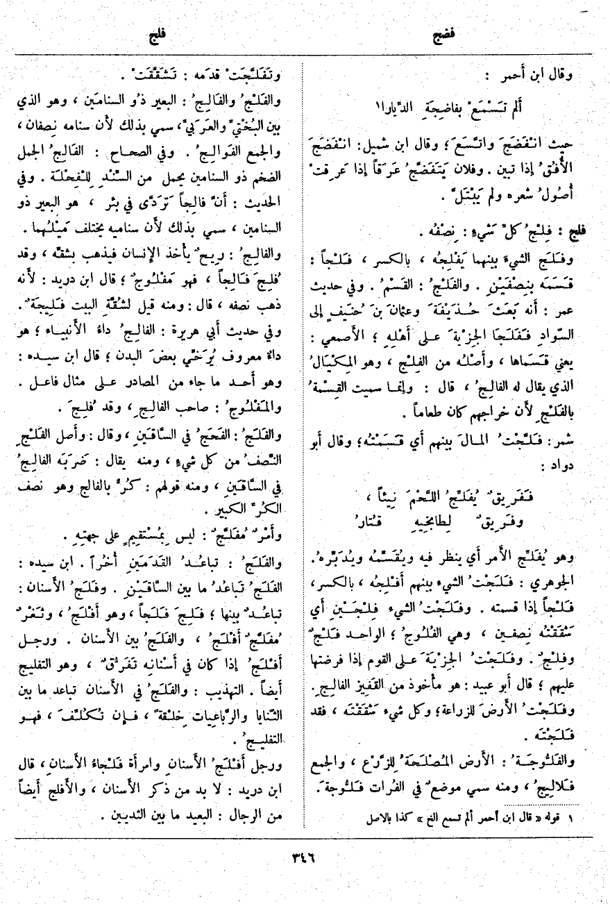 ؛ هُوَ داءٌ مَعْرُوفٌ يُرَخِّي بعضَ الْبَدَنِ؛ قَالَ ابْنُ سِيدَهْ: وَهُوَ أَحد مَا جَاءَ مِنْ الْمَصَادِرِ عَلَى مِثَالِ فَاعِلٍ. والمَفْلُوجُ: صَاحِبُ الفالِجِ، وَقَدْ فُلِجَ. والفَلَجُ: الفَحَجُ فِي السَّاقَينِ، وَقَالَ: وأَصل الفَلْجِ النِّصفُ مِنْ كُلِّ شيءٍ، وَمِنْهُ يُقَالُ: ضَرَبَه الفالِجُ فِي السَّاقَينِ، وَمِنْهُ قَوْلُهُمْ: كُرٌّ بِالْفَالِجِ وَهُوَ نِصْفُ الكُرِّ الْكَبِيرِ. وأَمْرٌ مُفَلَّجٌ: لَيْسَ بِمُسْتقِيمٍ عَلَى جهتِهِ. والفَلَجُ: تباعُدُ القَدَمَينِ أُخُراً. ابْنُ سِيدَهْ: الفَلَجُ تَباعُدُ مَا بَيْنَ السَّاقَيْنِ. وفَلَجُ الأَسنان: تباعُدٌ بَيْنَهَا؛ فَلِجَ فَلَجاً، وَهُوَ أَفْلَجُ، وثَغْرٌ مُفَلَّجٌ أَفْلَجُ، والفَلَجُ بَيْنَ الأَسنان. وَرَجُلٌ أَفْلَجُ إِذا كَانَ فِي أَسْنانِه تَفَرُّقٌ، وَهُوَ التَّفْلِيجُ أَيضاً. التَّهْذِيبُ: والفَلَجُ فِي الأَسنان تَبَاعُدُ مَا بَيْنَ الثَّنَايَا والرَّباعِيات خِلْقةً، فإِن تُكُلِّفَ، فَهُوَ التفليجُ. وَرَجُلٌ أَفْلَجُ الأَسنانِ وامرأَة فَلْجاءُ الأَسنانِ، قَالَ ابْنُ دُرَيْدٍ: لَا بُدَّ مِنْ ذِكْرِ الأَسنان، والأَفلج أَيضاً مِنَ الرِّجَالِ: الْبَعِيدُ مَا بَيْنَ الثديين.