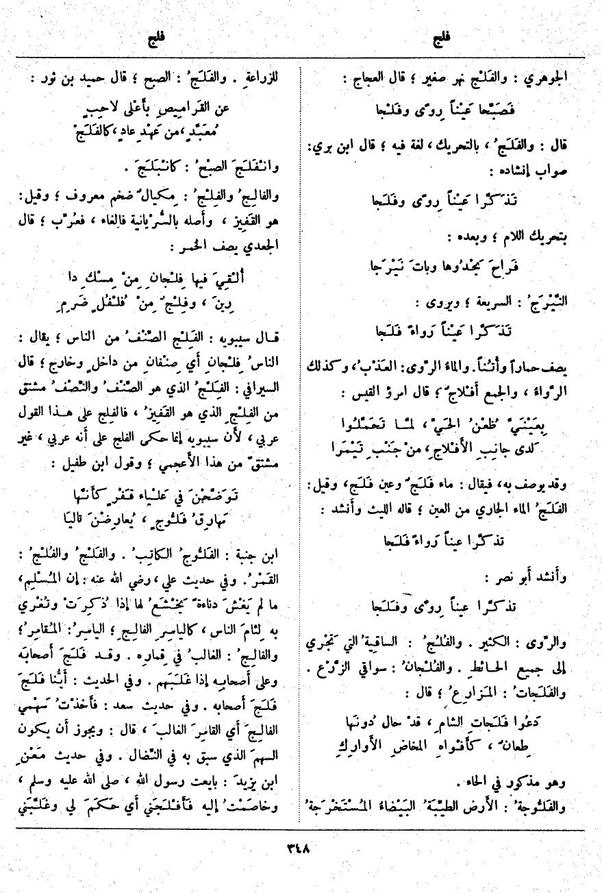 قَالَ: والفَلَجُ؛ بِالتَّحْرِيكِ، لُغَةٌ فِيهِ؛ قَالَ ابْنُ بَرِّيٍّ: صَوَابُ إِنشاده: