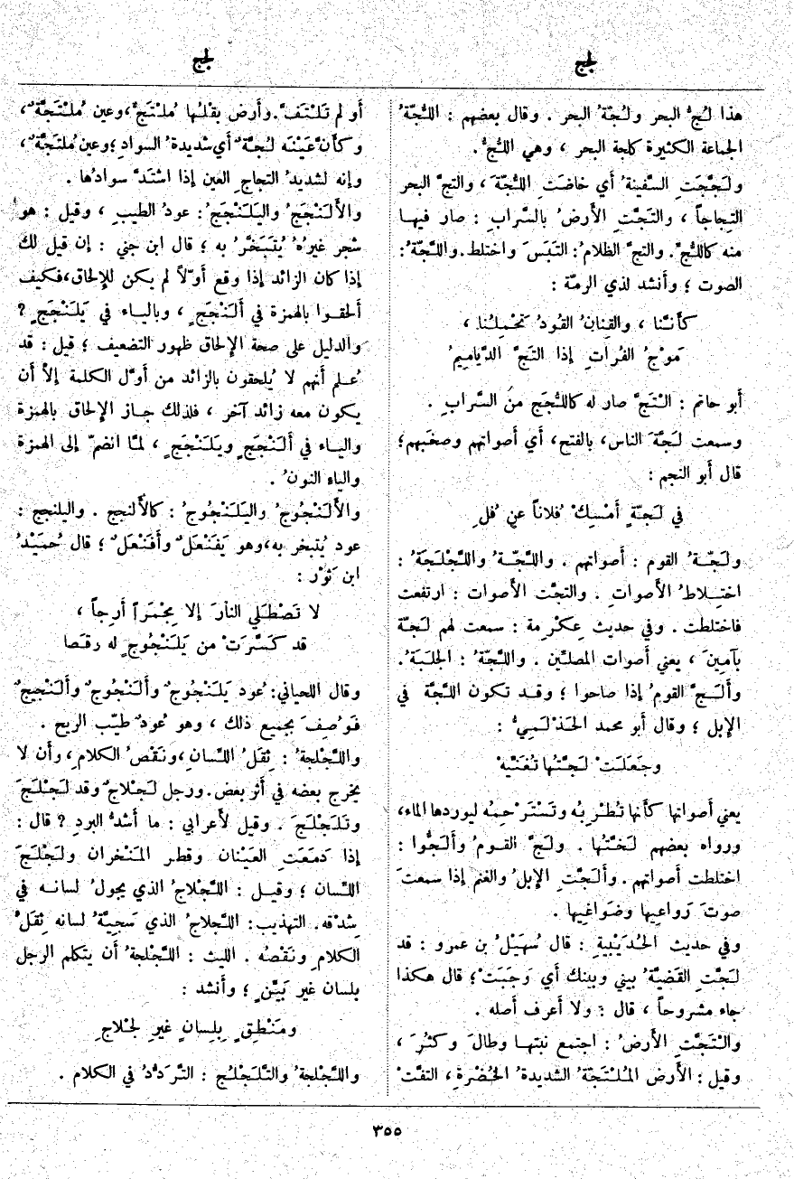 هَذَا لُجُّ الْبَحْرِ ولُجَّةُ الْبَحْرِ. وَقَالَ بَعْضُهُمْ اللُّجّةُ الْجَمَاعَةُ الْكَثِيرَةُ كَلُجَّةِ الْبَحْرِ، وَهِيَ اللُّجُّ. ولَجَّجَتِ السَّفينةُ أَي خاضَتِ اللُّجَّةَ، والتجَّ الْبَحْرُ التِجاجاً، والتَجَّتِ الأَرضُ بالسَّرابِ: صَارَ فِيهَا مِنْهُ كاللُّجِّ. والتجَّ الظلامُ: التَبَسَ وَاخْتَلَطَ. واللَّجّةُ: الصَّوْتُ؛ وأَنشد لِذِي الرُّمَّةِ: