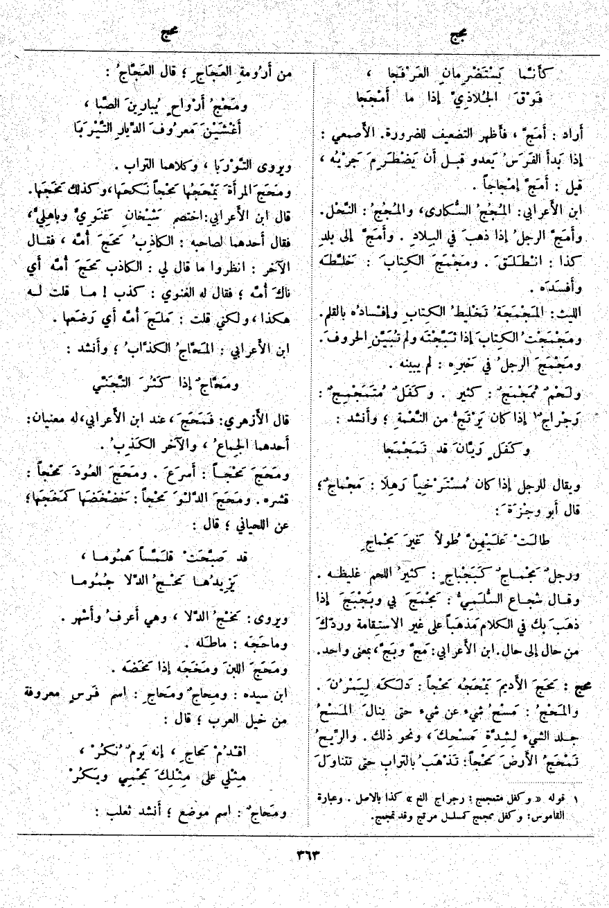 أَراد: أَمَجَّ، فأَظهر التَّضْعِيفَ لِلضَّرُورَةِ. الأَصمعي: إِذا بَدأَ الفَرَسُ يَعدو قَبْلَ أَن يَضْطَرِمَ جَرْيُه، قِيلَ: أَمَجَّ إِمْجاجاً. ابْنُ الأَعرابي: المُجُجُ السُّكارى، والمُجُجُ: النَّحْل. وأَمَجَّ الرجلُ إِذا ذهبَ فِي البِلادِ. وأَمَجَّ إِلى بلدِ كَذَا: انْطَلَقَ. ومَجْمَجَ الكِتابَ: خَلَّطَه وأَفسَدَه. اللَّيْثُ: المَجْمَجَةُ تَخْليطُ الكِتابِ وإِفْسادُه بِالْقَلَمِ. ومَجْمَجْتُ الكِتابَ إِذا ثَبَّجْتَه وَلَمْ تُبَيِّنِ الحروفَ. ومَجْمَجَ الرجلُ فِي خَبرِه: لَمْ يُبَيِّنْهُ. ولَحْمٌ مُمَجْمَجٌ: كَثِيرٌ. وكَفَلٌ مُتَمَجْمِجٌ: رَجْراجٌ «1» إِذا كَانَ يَرْتَجُّ مِنَ النَّعْمةِ؛ وأَنشد: