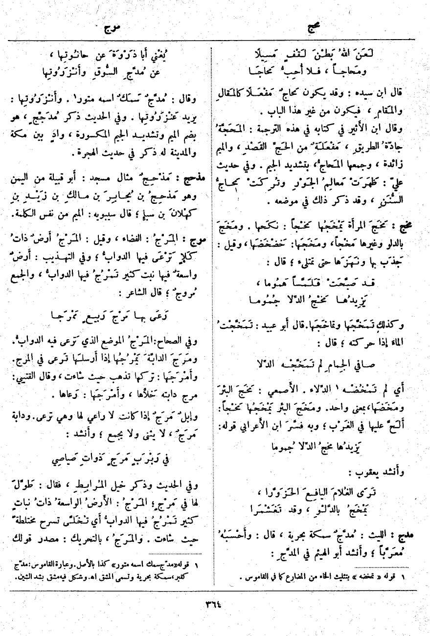 مرج: المَرْجُ: الْفَضَاءُ، وَقِيلَ: المَرْجُ أَرضٌ ذاتُ كَلإٍ تَرْعَى فِيهَا الدوابُّ؛ وَفِي التَّهْذِيبِ: أَرضٌ واسعةٌ فِيهَا نَبْتٌ كَثِيرٌ تَمْرُجُ فِيهَا الدوابُّ، وَالْجَمْعُ مُروجٌ؛ قَالَ الشَّاعِرُ: