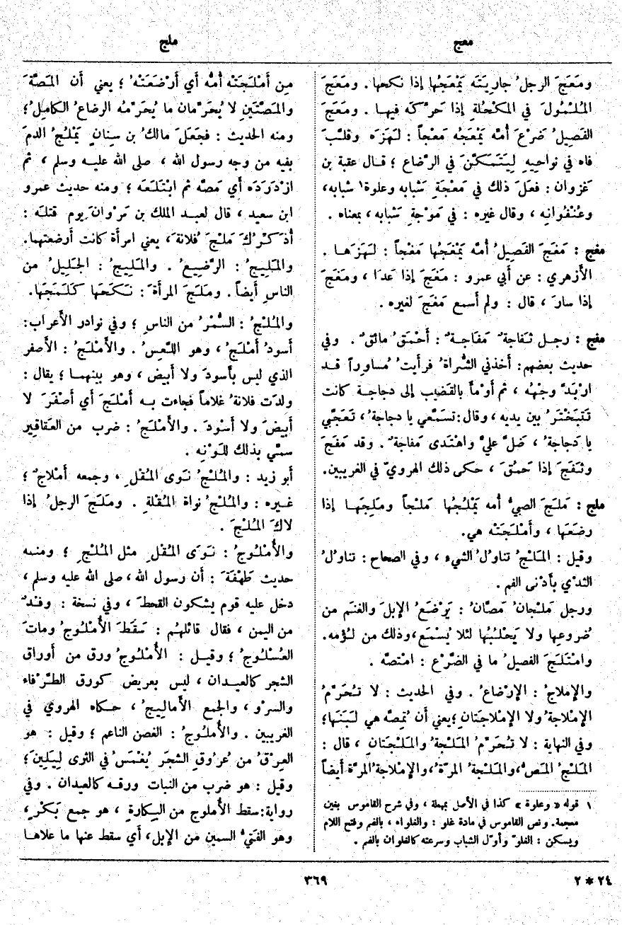، يَعْنِي امرأَة كَانَتْ أَرضعتهما. والمَلِيجُ: الرَّضِيعُ. والمَلِيجُ: الجَلِيلُ مِنَ الناسِ أَيضاً. ومَلَجَ المرأَةَ: نَكَحَها كَلَمَجَها. والمُلْجُ: السُّمْرُ مِنَ الناسِ؛ وَفِي نَوَادِرِ الأَعراب: أَسودُ أَمْلَجُ، وَهُوَ اللَّعِسُ. والأَمْلَجُ: الأَصفر الَّذِي لَيْسَ بأَسودَ وَلَا أَبيض، وَهُوَ بَيْنَهُمَا؛ يُقَالُ: ولدَت فلانةُ غُلَامًا فَجَاءَتْ بِهِ أَمْلَجَ أَي أَصْفَرَ لَا أَبيضَ وَلَا أَسْودَ. والأَمْلَجُ: ضَرْبٌ مِنَ العَقاقِير سمِّي بِذَلِكَ للَوْنِه. أَبو زَيْدٍ: والمُلْجُ نَوى المُقْلِ، وَجَمْعُهُ أَمْلاجٌ؛ غَيْرُهُ: والمُلْجُ نَوَاةُ المُقْلةِ. ومَلَجَ الرجلُ إِذا لاكَ المُلْجَ. والأُمْلُوجُ: نَوَى المُقْلِ مِثْلَ المُلْجِ؛ وَمِنْهُ حَدِيثُ