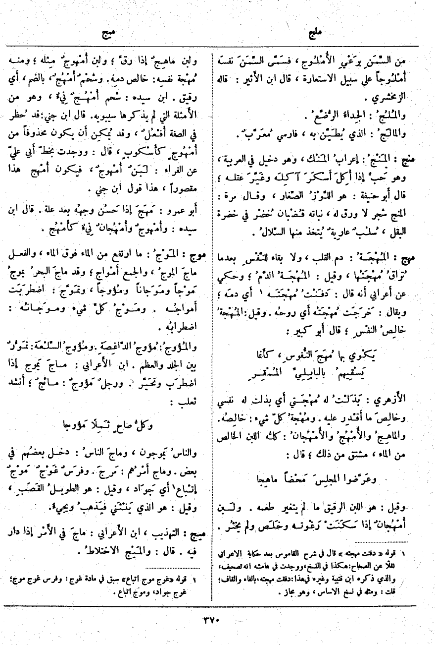 وَقِيلَ: هُوَ اللَّبَنُ الرَّقِيقُ مَا لَمْ يَتَغَيَّرْ طَعْمُهُ. ولَبن أُمْهُجانٌ إِذا سَكَنَتْ رَغْوته وخَلَص وَلَمْ يخثُر. وَلَبَنٌ ماهِجٌ إِذا رقَّ؛ وَلَبَنٌ أُمْهوجٌ مِثله؛ وَمِنْهُ مُهْجة نفسِه: خَالِصُ دمِه. وشحْمٌ أُمْهُجٌ، بِالضَّمِّ، أَي رَقِيقٌ. ابْنُ سِيدَهْ: شَحْمٌ أُمْهُجٌ نِيءٌ، وَهُوَ مِنَ الأَمثلة الَّتِي لَمْ يَذْكُرْهَا سِيبَوَيْهِ. قَالَ ابْنُ جِنِّي: قَدْ حُظر فِي الصِّفَةِ أُفْعُلٌ، وَقَدْ يُمكِن أَن يَكُونَ مَحْذُوفًا مِنْ أُمْهُوجٍ كأُسْكوبٍ، قَالَ: وَوَجَدْتُ بِخَطِّ أَبي عَلِيٍّ عَنِ الْفَرَّاءِ: لَبَنٌ أُمْهوجٌ، فَيَكُونُ أُمْهج هَذَا مَقْصُورًا، هَذَا قَوْلُ ابْنِ جِنِّي. أَبو عَمْرٍو: مَهَجَ إِذا حَسُن وجهُه بَعْدَ عِلَّةٍ. قَالَ ابْنُ سِيدَهْ: وأُمْهوجٌ وأُمْهُجانٌ نِيءٌ كأُمْهُج.