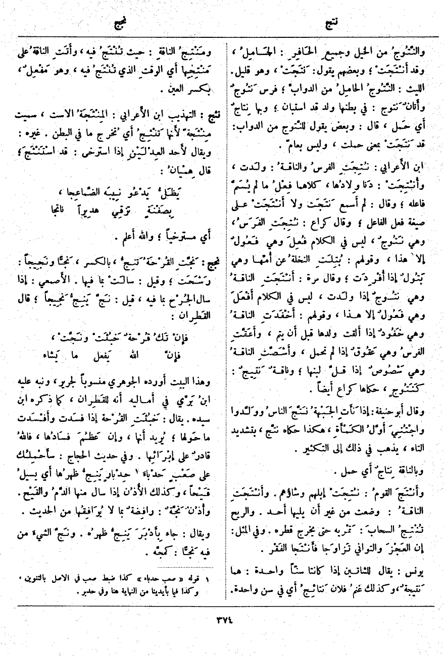 والنَّتُوجُ مِنَ الْخَيْلِ وجميعِ الحَافِرِ: الحَامِلُ، وَقَدْ أَنْتَجَتْ؛ وَبَعْضُهُمْ يَقُولُ: نَتَجَتْ، وَهُوَ قَلِيلٌ. اللَّيْثُ: النَّتُوجُ الحامِلُ مِنَ الدوابِّ؛ فَرَسٌ نَتُوجٌ وأَتانٌ نَتوج: فِي بَطْنِهَا وَلَدٌ قَدِ اسْتَبَانَ؛ وَبِهَا نِتاجٌ أَي حَمل، قَالَ: وَبَعْضٌ يَقُولُ للنَّتوج مِنَ الدَّوَابِّ: قَدْ نَتَجَتْ بِمَعْنَى حَمَلَتْ، وَلَيْسَ بِعَامٍّ. ابْنُ الأَعرابي: نُتِجَتِ الفرسُ والناقةُ: ولَدت، وأُنْتِجَتْ: دَنا وِلادُها، كِلَاهُمَا فِعْلُ مَا لَمْ يُسَمَّ فَاعِلُهُ؛ وَقَالَ: لَمْ أَسمع نَتَجَت وَلَا أَنْتَجَتْ عَلَى صِيغَةِ فِعْلِ الْفَاعِلِ؛ وَقَالَ كُرَاعٌ: نُتِجَتِ الفَرَسُ، وَهِيَ نَتُوجٌ، لَيْسَ فِي الْكَلَامِ فُعِلَ وَهِيَ فَعُولٌ إِلا هَذَا، وَقَوْلُهُمْ: بُتِلَتِ النخلةُ عَنْ أُمِّها وَهِيَ بَتُولٌ إِذا أُفْرِدَت؛ وَقَالَ مُرَّةُ: أَنْتَجَتِ الناقةُ وَهِيَ نتُوجٌ إِذا ولَدت، لَيْسَ فِي الْكَلَامِ أَفْعَلَ وَهِيَ فَعُولٌ إِلا هَذَا، وَقَوْلُهُمْ: أَخْفَدَتِ الناقةُ وَهِيَ خَفُودٌ إِذا أَلقت وَلَدَهَا قَبْلَ أَن يَتِمَّ، وأَعَقَّتِ الفرسُ وَهِيَ عَقُوقٌ إِذا لَمْ تَحْمِلُ، وأَشَصَّتِ الناقةُ وَهِيَ شَصُوصٌ إِذا قلَّ لِبَنُهَا؛ وناقةٌ نَتِيجٌ: كَنَتُوجٍ، حَكَاهَا كُرَاعٌ أَيضاً. وَقَالَ أَبو حَنِيفَةَ: إِذا نَأَتِ الجَبْهةُ نَتَّجَ الناسُ ووَلَّدوا واجْتُنِيَ أَوَّلُ الكَمْأَةِ، هَكَذَا حَكَاهُ نتَّج، بِتَشْدِيدِ التَّاءِ، يَذْهَبُ فِي ذَلِكَ إِلى التَّكْثِيرِ. وَبِالنَّاقَةِ نِتاجٌ أَي حَمْلٌ. وأَنْتَجَ القومُ: نُتِجَتْ إِبلهم وشاؤُهم. وأَنْتَجَتِ الناقةُ: وَضَعَتْ مِنْ غَيْرِ أَن يَلِيَهَا أَحد. وَالرِّيحُ تُنْتِجُ السحابَ: تَمْريه حَتَّى يَخْرُجَ قَطْرُهُ. وَفِي الْمَثَلِ: إِن العَجْزَ وَالتَّوَانِيَ تَزاوَجا فأَنْتَجا الفَقْر. يُونُسُ: يُقَالُ لِلشَّاتَيْنِ إِذا كَانَتَا سِنًّا وَاحِدَةً: هُمَا نَتيجةٌ، وَكَذَلِكَ غنمُ فُلَانٍ نَتائِجُ أَي فِي سِنٍّ وَاحِدَةٍ. ومَنْتِجُ الناقةِ: حَيْثُ تُنْتَجُ فِيهِ، وأَتَتِ الناقةُ عَلَى مَنْتِجِها أَي الوقتِ الَّذِي تُنْتَجُ فِيهِ، وَهُوَ مَفْعِلٌ، بكسر العين.