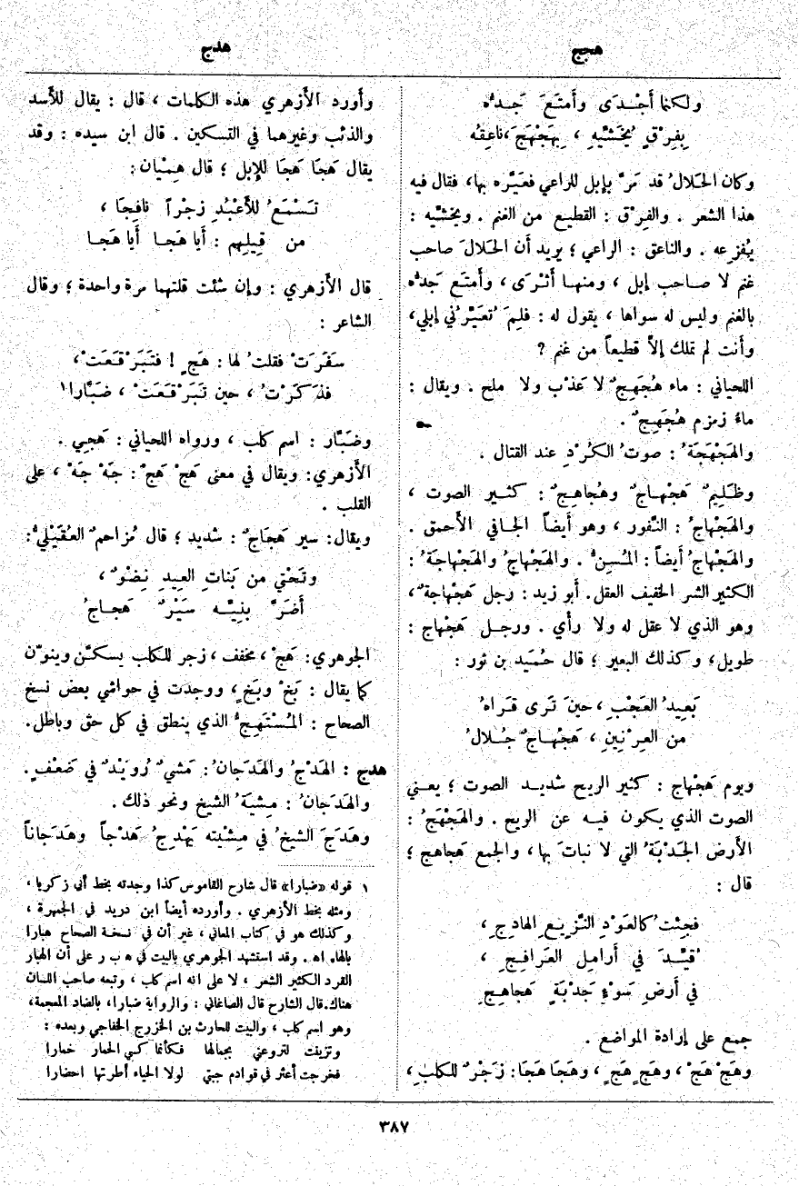 وَكَانَ الحَلالُ قَدْ مَرَّ بإِبل لِلرَّاعِي فعَيَّره بِهَا، فَقَالَ فِيهِ هَذَا الشِّعْرَ. والفِرْق: الْقَطِيعُ مِنَ الْغَنَمِ. ويخشِّيه: يفزِعه. وَالنَّاعِقُ: الرَّاعِي؛ يُرِيدُ أَن الحَلالَ صَاحِبُ غَنَمٍ لَا صَاحِبُ إِبل، وَمِنْهَا أَثْرَى، وأَمتَع جَدُّه بِالْغَنَمِ وَلَيْسَ لَهُ سِوَاهَا، يَقُولُ لَهُ: فلِمَ تُعَيِّرُني إِبلي، وأَنت لَمْ تَمْلِكْ إِلَّا قَطِيعًا مِنْ غَنَمٍ؟ اللِّحْيَانِيُّ: مَاءٌ هُجَهِجٌ لَا عَذْب وَلَا مِلْحٌ. وَيُقَالُ: ماءُ زَمْزَمَ هُجَهِجٌ. والهَجْهَجَةُ: صوتُ الكُرْدِ عِنْدَ الْقِتَالِ. وظَلِيمٌ هَجْهاجٌ وهُجاهِجٌ: كَثِيرُ الصَّوْتِ، والهَجْهاجُ: النَّفور، وَهُوَ أَيضاً الْجَافِي الأَحمق. والهَجْهاجُ أَيضاً: المُسِنُّ. والهَجْهاجُ والهَجْهاجَةُ: الْكَثِيرُ الشَّرِ الْخَفِيفُ الْعَقْلِ. أَبو زَيْدٍ: رَجُلٌ هَجْهاجةٌ، وَهُوَ الَّذِي لَا عَقْلَ لَهُ وَلَا رأْي. وَرَجُلٌ هَجْهاج: طَوِيلٌ، وَكَذَلِكَ الْبَعِيرُ: قَالَ حُمَيد بْنُ ثَوْرٍ: