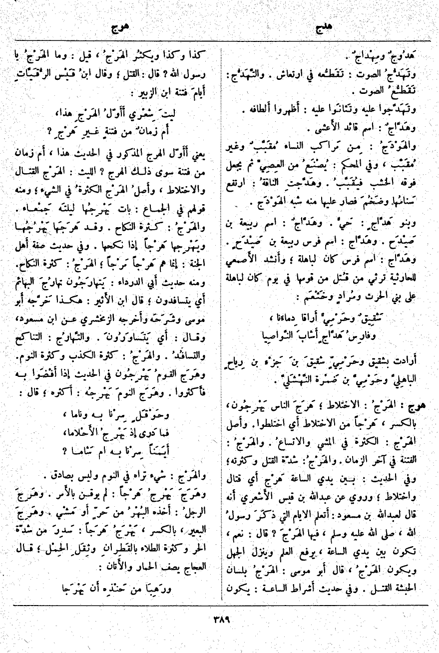 هرج: الهَرْجُ: الِاخْتِلَاطُ؛ هَرَجَ النَّاسُ يَهْرِجُون، بِالْكَسْرِ، هَرْجاً مِنَ الِاخْتِلَاطِ أَي اخْتَلَطُوا. وأَصل الهَرْج: الْكَثْرَةُ فِي الْمَشْيِ والاتساعُ. والهَرْجُ: الْفِتْنَةُ فِي آخِرِ الزَّمَانِ. والهَرْجُ: شدَّة الْقَتْلِ وَكَثْرَتُهُ؛ وَفِي الْحَدِيثِ: