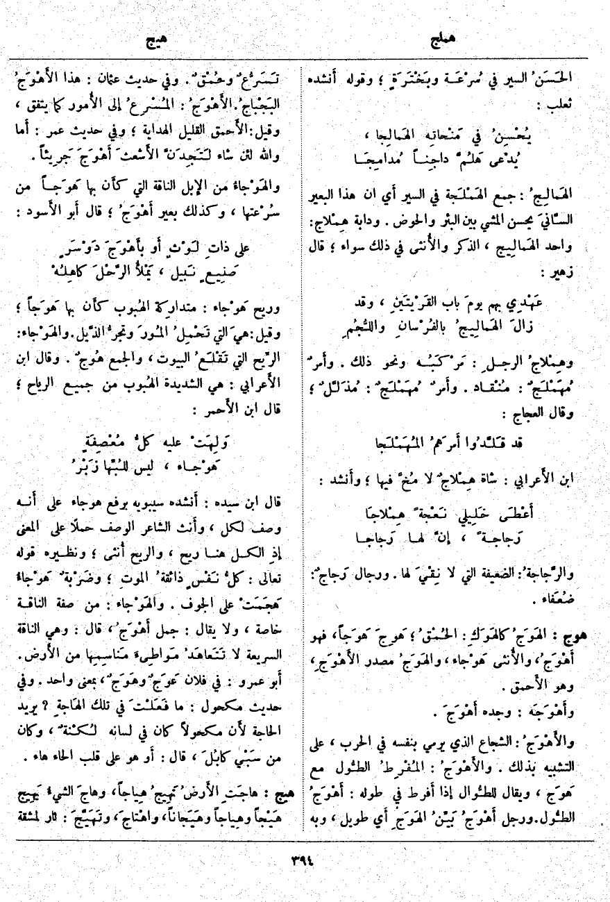 هوج: الهَوَجُ كالهَوَكِ: الحُمْقُ؛ هَوِجَ هَوَجاً، فَهُوَ أَهْوَجُ، والأُنثى هَوْجاء، والهَوَجُ مَصْدَرُ الأَهْوَجِ، وَهُوَ الأَحمق. وأَهْوَجَه: وَجَدَهُ أَهْوَجَ. والأَهْوَجُ: الشُّجَاعُ الَّذِي يَرْمِي بِنَفْسِهِ فِي الْحَرْبِ، عَلَى التَّشْبِيهِ بِذَلِكَ. والأَهْوَجُ: المُفْرِطُ الطُّول مَعَ هَوَج، وَيُقَالُ للطُّوال إِذا أَفرط فِي طُولِهِ: أَهْوَجُ الطُّول. وَرَجُلٌ أَهْوَجُ بَيِّنُ الهَوَجِ أَي طَوِيلٌ، وَبِهِ تَسَرُّعٌ وحُمْقٌ. وَفِي حَدِيثِ