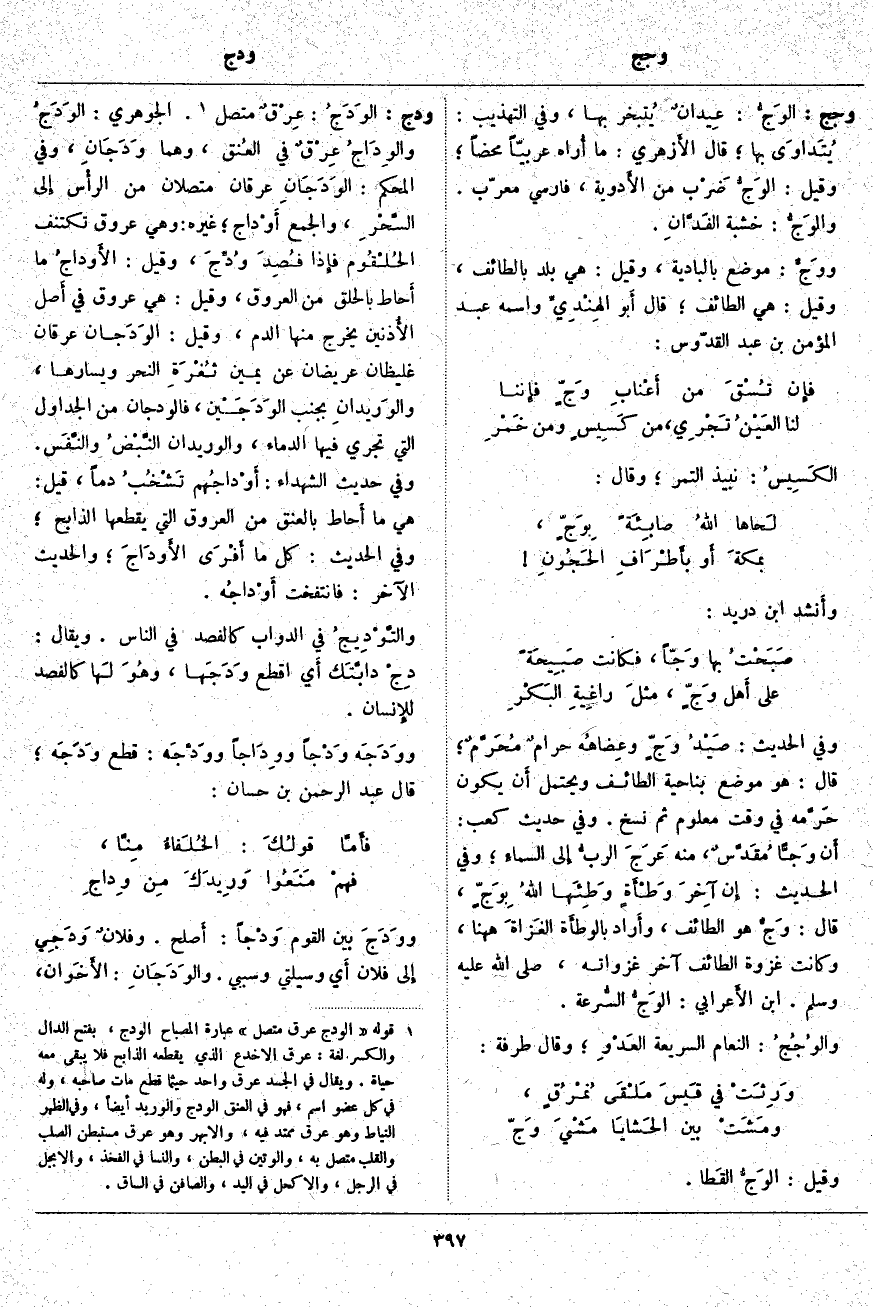 ودج: الوَدَجُ: عِرْقٌ مُتَّصِلٌ «1». الْجَوْهَرِيُّ: الوَدَجُ والوِدَاجُ عِرْقٌ فِي العُنق، وَهُمَا وَدَجانِ، وَفِي الْمُحْكَمِ: الوَدَجانِ عِرْقَانِ مُتَّصِلَانِ مِنَ الرأْس إِلى السَّحْرِ، وَالْجَمْعُ أَوْداج؛ غَيْرُهُ: وَهِيَ عُرُوقٌ تَكْتَنِفُ الحُلْقُوم فإِذا فُصِدَ وُدِّجَ، وَقِيلَ: الأَوداجُ مَا أَحاط بِالْحَلْقِ مِنَ الْعُرُوقِ، وَقِيلَ: هِيَ عُرُوقٌ فِي أَصل الأُذنين يَخْرُجُ مِنْهَا الدَّمُ، وَقِيلَ: الوَدَجان عِرْقَانِ غَلِيظَانِ عَرِيضَانِ عَنْ يَمِينِ ثُغْرَةِ النَّحْرِ وَيَسَارِهَا، والوَريدانِ بِجَنْبِ الوَدَجَيْن، فَالْوَدَجَانِ مِنَ الْجَدَاوِلِ الَّتِي تَجْرِي فِيهَا الدِّمَاءُ، وَالْوَرِيدَانِ النَّبْضُ والنَّفَس. وَفِي حَدِيثِ الشُّهَدَاءِ: