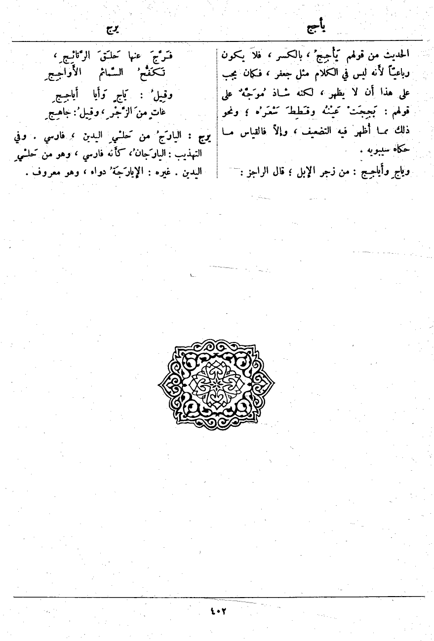 الْحَدِيثِ مِنْ قَوْلِهِمْ يَأْجِجُ، بِالْكَسْرِ، فَلَا يَكُونُ رُبَاعِيًّا لأَنه لَيْسَ فِي الْكَلَامِ مِثْلَ جَعْفَرٍ، فَكَانَ يَجِبُ عَلَى هَذَا أَن لَا يَظْهَرَ، لَكِنَّهُ شَاذٌّ مُوَجَّهٌ عَلَى قَوْلِهِمْ: بَجِجَتْ عَيْنُه وقَطِطَ شَعَرُه؛ وَنَحْوَ ذَلِكَ مِمَّا أُظهر فِيهِ التَّضْعِيفَ، وإِلَّا فَالْقِيَاسُ مَا حَكَاهُ سِيبَوَيْهِ. وياجِ وأَياجِج: مِنْ زَجْرِ الإِبل؛ قَالَ الرَّاجِزُ: