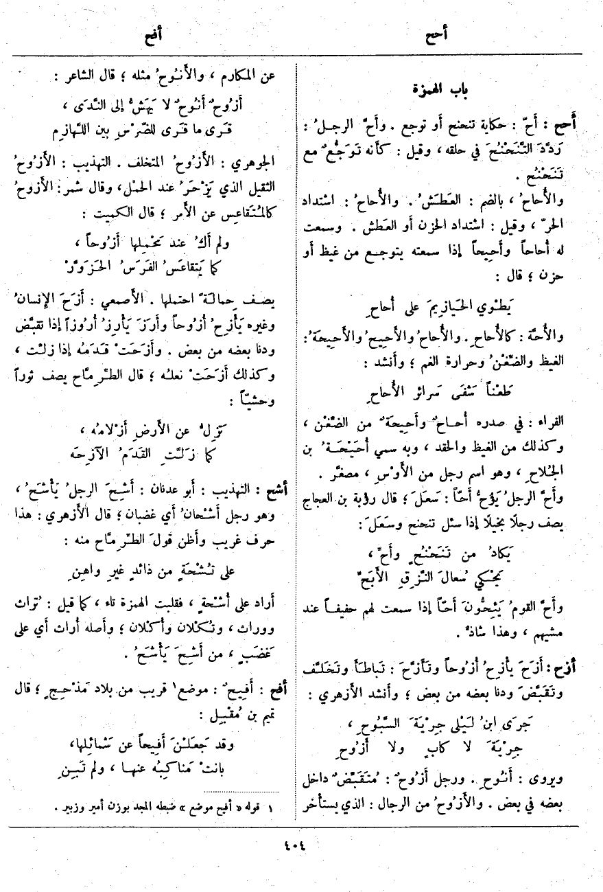 أحح: أَحّ: حِكَايَةً تَنَحْنَحَ أَو تَوَجَّعَ. وأَحَّ الرجلُ: رَدَّدَ التَّنَحْنُحَ فِي حَلْقِهِ، وَقِيلَ: كأَنه تَوَجُّعٌ مَعَ تَنَحْنُح. والأُحاحُ، بِالضَّمِّ: العَطَشُ. والأُحاحُ: اشْتِدَادُ الْحَرِّ، وَقِيلَ: اشْتِدَادُ الْحُزْنِ أَو العَطش. وَسَمِعْتُ لَهُ أُحاحاً وأَحِيحاً إِذا سَمِعْتُهُ يَتَوَجَّعُ مِنْ غَيْظٍ أَو حُزْنٍ؛ قَالَ: