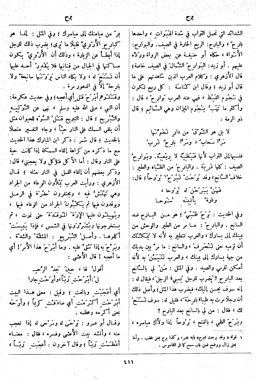 ؛ قَالَ: التَّبْرِيحُ قَتْلُ السَّوْءِ لِلْحَيَوَانِ مِثْلَ أَن يُلْقَى السَّمَكُ عَلَى النَّارِ حَيًّا، وَجَاءَ التَّفْسِيرُ مُتَّصِلًا بِالْحَدِيثِ؛ قَالَ شَمِرٌ: ذَكَرَ ابْنُ الْمُبَارَكِ هَذَا الْحَدِيثَ مَعَ مَا ذَكَرَهُ مِنْ كَرَاهَةِ إِلقاء السَّمَكَةِ إِذا كَانَتْ حَيَّةً عَلَى النَّارِ وَقَالَ: أَما الأَكل فتؤْكل وَلَا يُعْجِبُنِي، قَالَ: وَذَكَرَ بَعْضُهُمْ أَن إِلقاء الْقَمْلِ فِي النَّارِ مِثْلُهُ؛ قَالَ الأَزهري: ورأَيت الْعَرَبَ يَمْلأُون الوِعاءَ مِنَ الْجَرَادِ وَهِيَ تَهْتَشُّ فِيهِ، وَيَحْتَفِرُونَ حُفْرَة فِي الرَّمْلِ وَيُوقِدُونَ فِيهَا ثُمَّ يَكُبُّونَ الْجَرَادَ مِنَ الْوِعَاءِ فِيهَا، ويُهِيلُون عَلَيْهَا الإِرَةَ المُوقَدَةَ حَتَّى تَمُوتَ، ثُمَّ يَسْتَخْرِجُونَهَا ويُشَرِّرُونها فِي الشَّمْسِ، فإِذا يَبِسَتْ أَكلوها. وأَصلُ التَّبْرِيحِ: المشقَّةُ وَالشِّدَّةُ. وبَرَّحَ بِهِ إِذا شَقَّ عَلَيْهِ. وَمَا أَبْرَحَ هَذَا الأَمرَ أَي مَا أَعجبه قَالَ الأَعشى:
