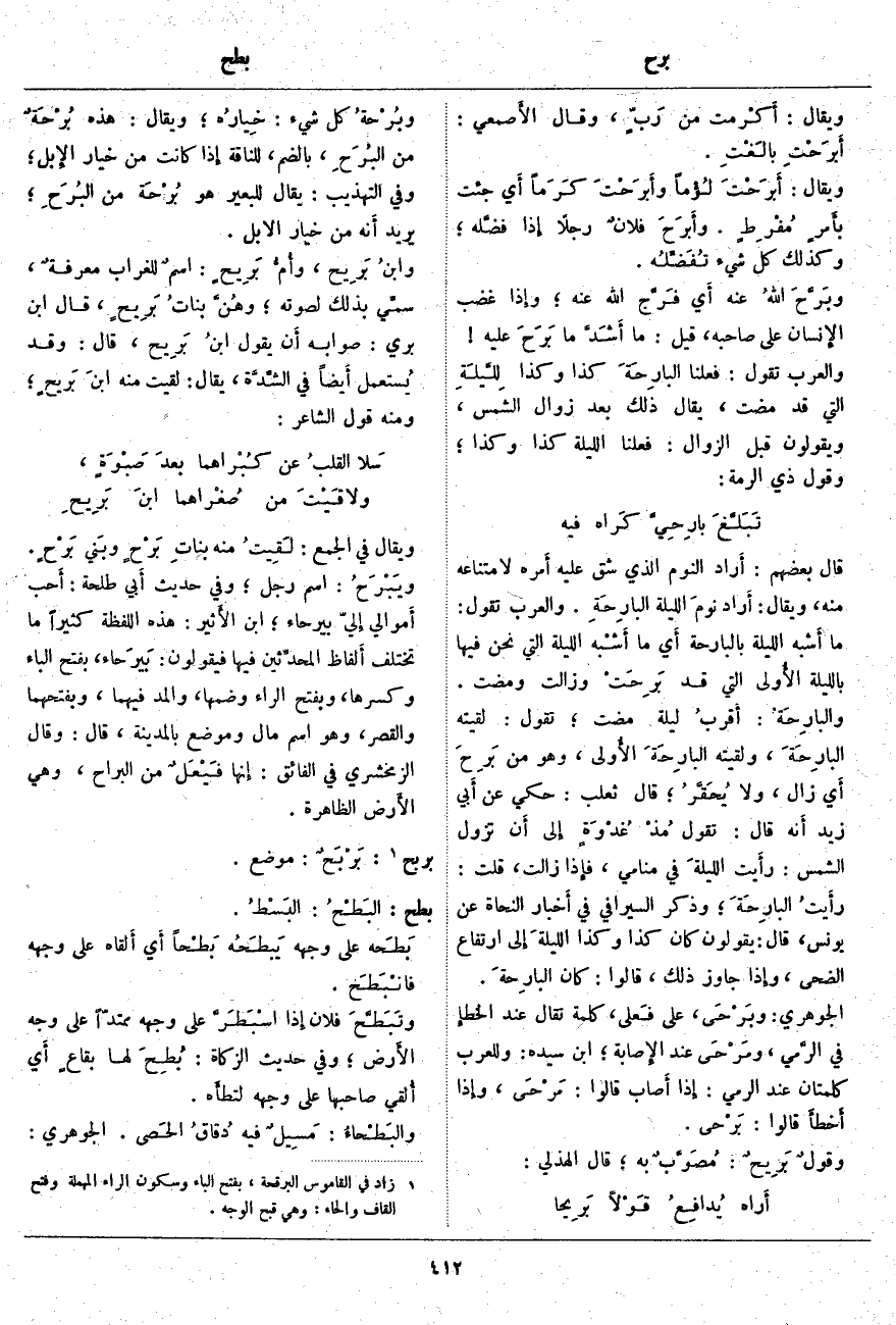 وَيُقَالُ: أَكْرمت مِنْ رَبٍّ، وَقَالَ الأَصمعي: أَبرَحْتِ بالَغْتِ. وَيُقَالُ: أَبرَحْتَ لُؤْماً وأَبرَحْتَ كَرَماً أَي جِئْتَ بأَمرٍ مُفْرِطٍ. وأَبرَحَ فلانٌ رَجَلًا إِذا فضَّله؛ وَكَذَلِكَ كُلُّ شَيْءٍ تُفَضِّلُه. وبَرَّحَ اللهُ عَنْهُ أَي فَرَّج اللَّهُ عَنْهُ؛ وإِذا غَضِبَ الإِنسان عَلَى صَاحِبِهِ، قِيلَ: مَا أَشَدَّ مَا بَرَحَ عَلَيْهِ وَالْعَرَبُ تَقُولُ: فَعَلْنَا البارِحَةَ كَذَا وَكَذَا لِلَّيلَةِ الَّتِي قَدْ مَضَتْ، يُقَالُ ذَلِكَ بَعْدَ زَوَالِ الشَّمْسِ، وَيَقُولُونَ قَبْلَ الزَّوَالِ: فَعَلْنَا اللَّيْلَةَ كَذَا وَكَذَا؛ وَقَوْلُ ذِي الرُّمَّةِ: