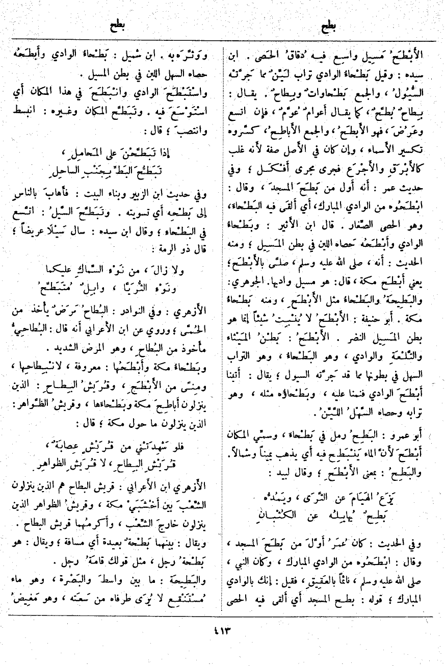 ؛ قَوْلُهُ: بَطَحَ الْمَسْجِدَ أَي أَلقى فِيهِ الْحَصَى ووَثَّرَه بِهِ. ابْنُ شُمَيْلٍ: بَطْحاءُ الْوَادِي وأَبطَحُه حَصَاهُ السَّهْلُ اللَّيِّنُ فِي بَطْنِ الْمُسِيلِ. واسْتَبْطَحَ الْوَادِي وانْبَطَحَ فِي هَذَا الْمَكَانِ أَي اسْتَوْسَعَ فِيهِ. وتَبَطَّح الْمَكَانُ وَغَيْرُهُ: انْبَسَطَ وانتصبَ؛ قَالَ: